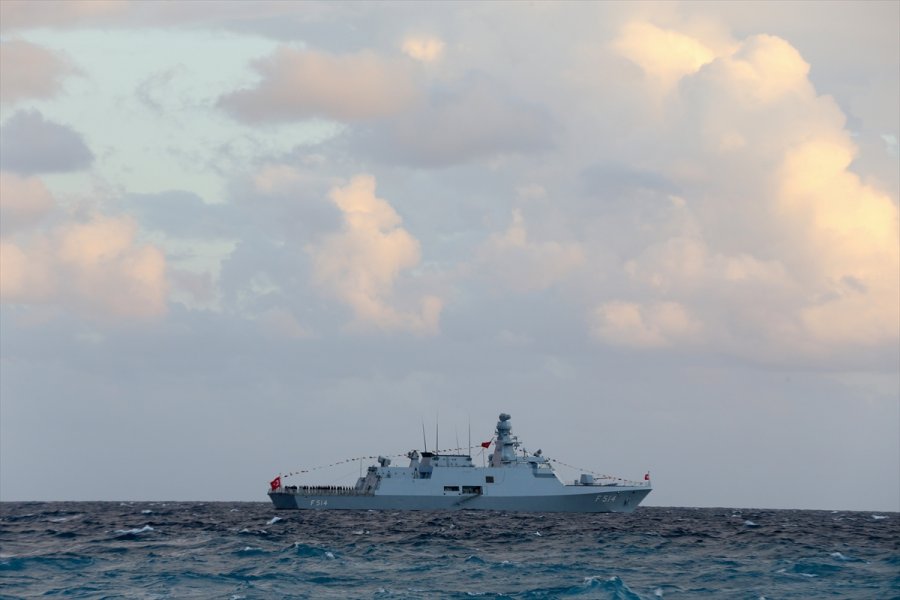 Konyaaltı sahili açıklarına demir atan yerli üretim korvet gemisi TCG Kınalıada (F-514) da araçların geçişi sırasında ışıklarıyla dikkati çekti.