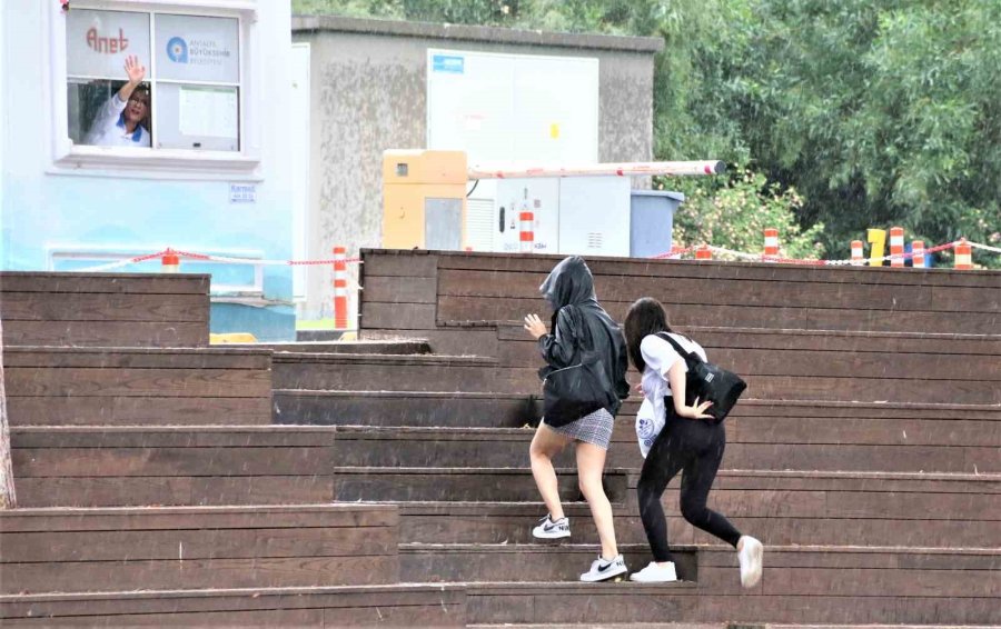 Antalya'da kısa süreli yağan şiddetli yağmur, vatandaşlara zor anlar yaşattı. Yağmur dolayısıyla dünyaca ünlü Konyaaltı Sahili kısa sürede boşaldı. Yağmura sahilde yakalanan vatandaşlardan bazıları apar topar kaçarken, bazıları da yüzmeye devam etti.