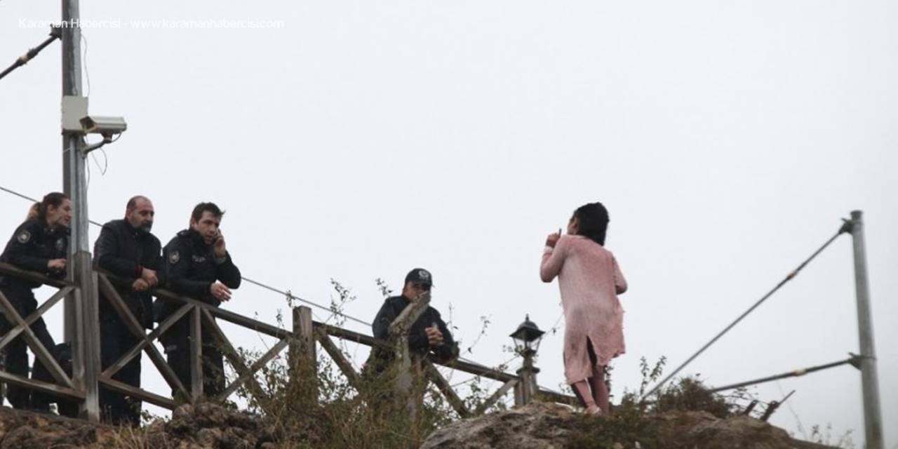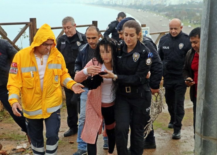 Polisi alarma geçiren olay, Muratpaşa ilçesi Konyaaltı Caddesi varyantlardaki falezlerde 12.30'da meydana geldi. Edinilen bilgiye göre, genç bir kadının yaklaşık 30 metre yükseklikteki falezlerin ucunda tehlikeli bir şekilde oturup ağladığını görenler, durumu polise bildirdi. İhbarın ardından bölgeye gelen polis, sağlık ekipleri ve itfaiye ekipleri talep etti. Diğer yandan olası bir olumsuzluğa karşı deniz polisi de kıyı kesimde hazır bekledi. İsminin E. S. (22) olduğu öğrenilen genç kadın ise polisin ikna çabasına uzun süre direndi. Alkollü olduğu gözlenen ve sık sık elindeki cep telefonundan birileriyle görüşen E. S., polisten de alkol vermesini talep etti. Zaman zaman uçurumun kenarında tehlikeli hareketler yapan E. S., verilen alkolü bir miktar içtikten sonra, cezaevindeki babası M. S. ile telefonda konuşmak istediğini söyledi. Tüm iknalar boşa çıkınca polis, cezaevi kurumuyla iletişime geçerek babaya ulaştı. Babasıyla telefonda görüşen genç kadın, ikna olarak polis tarafından kayalıklardan alındı.