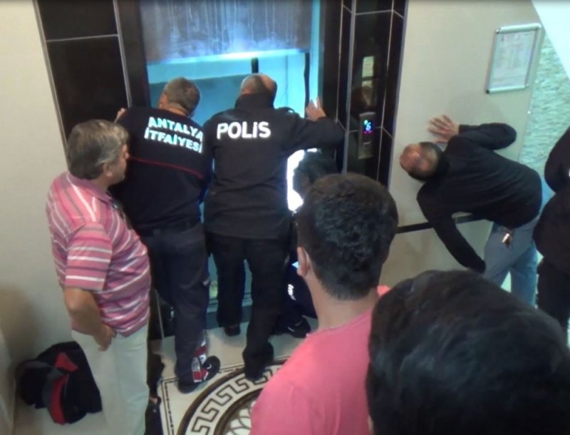 Antalya'da aralarında bir bebek ve 84 yaşında kadının da bulunduğu 6 kişilik aile, halatı koparak ikinci kattan düşen asansörde mahsur kaldı.