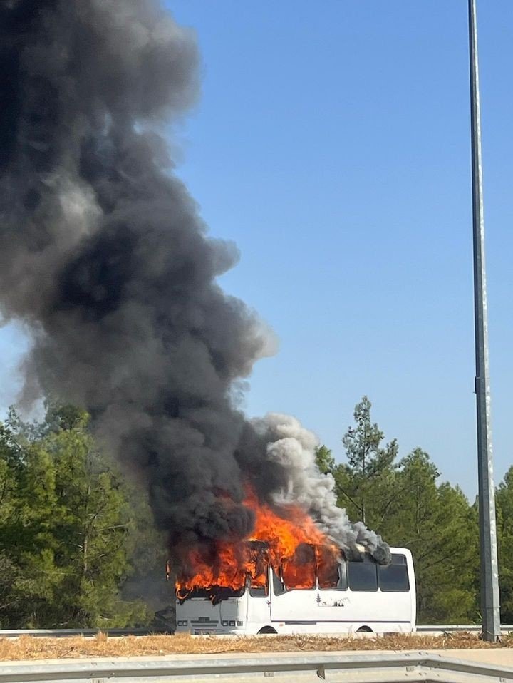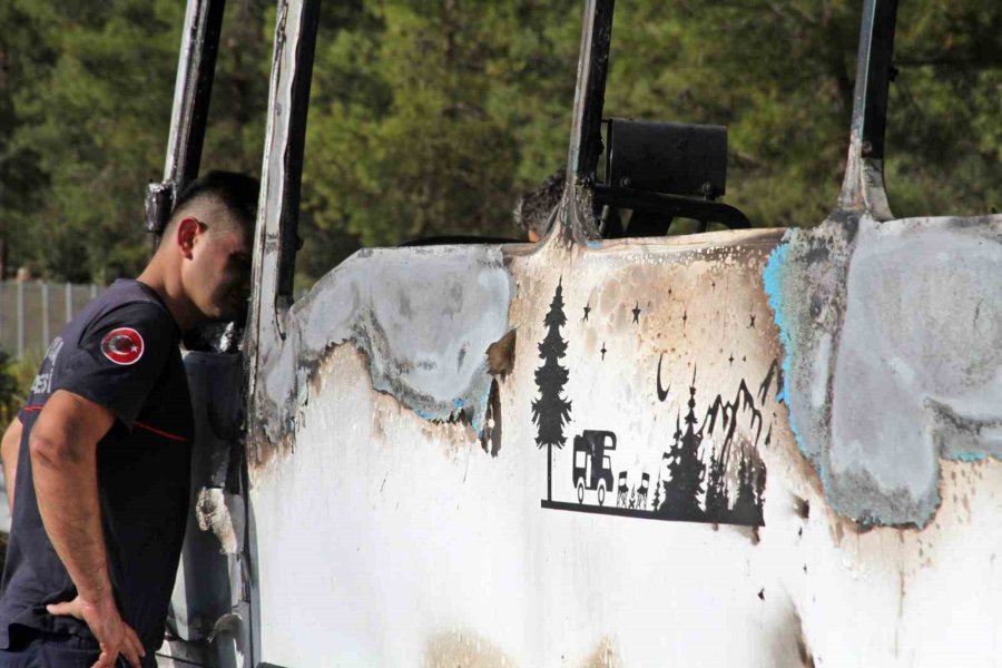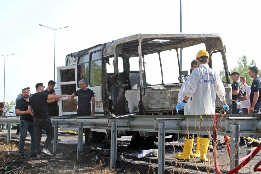 Antalya'da karavana çevrilen midibüs alev alev yandı, araçtaki bir kişi feci şekilde yanarak can verdi. Görgü tanıklarının ifadelerine göre midibüsteki kişinin en son alevleri söndürmeye çalıştığı belirtilirken, polisin araç içerisinde yaptığı incelemede de cesedin yanında yangın tüpünün olduğu öğrenildi.