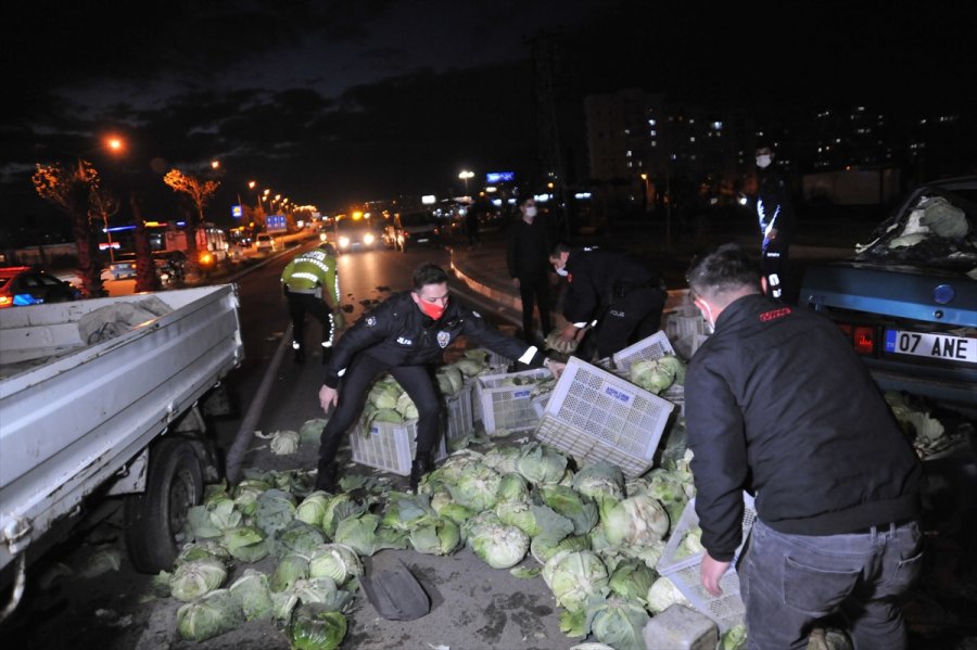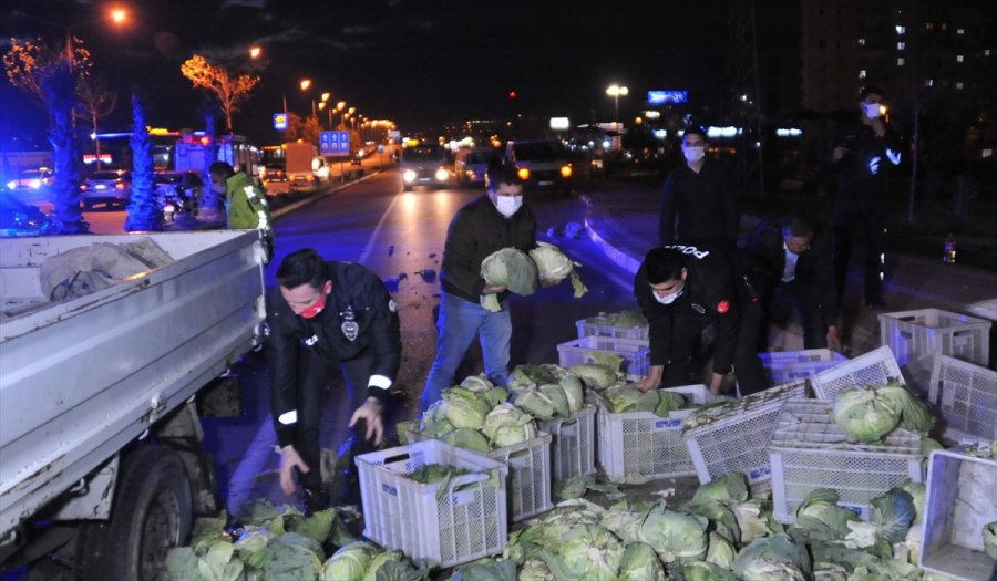 Antalya'da Kaza Nedeniyle Yola Saçılan Lahanaları Polisler Topladı