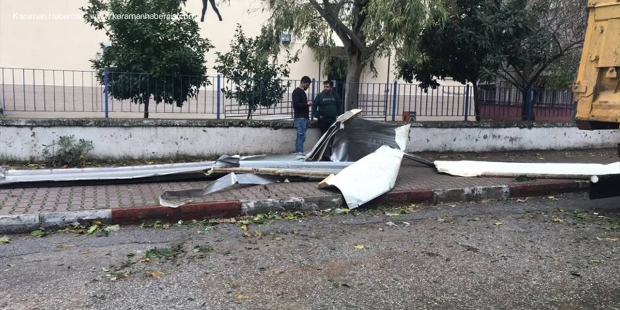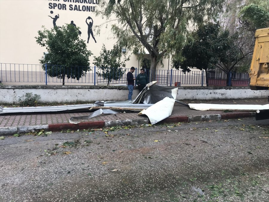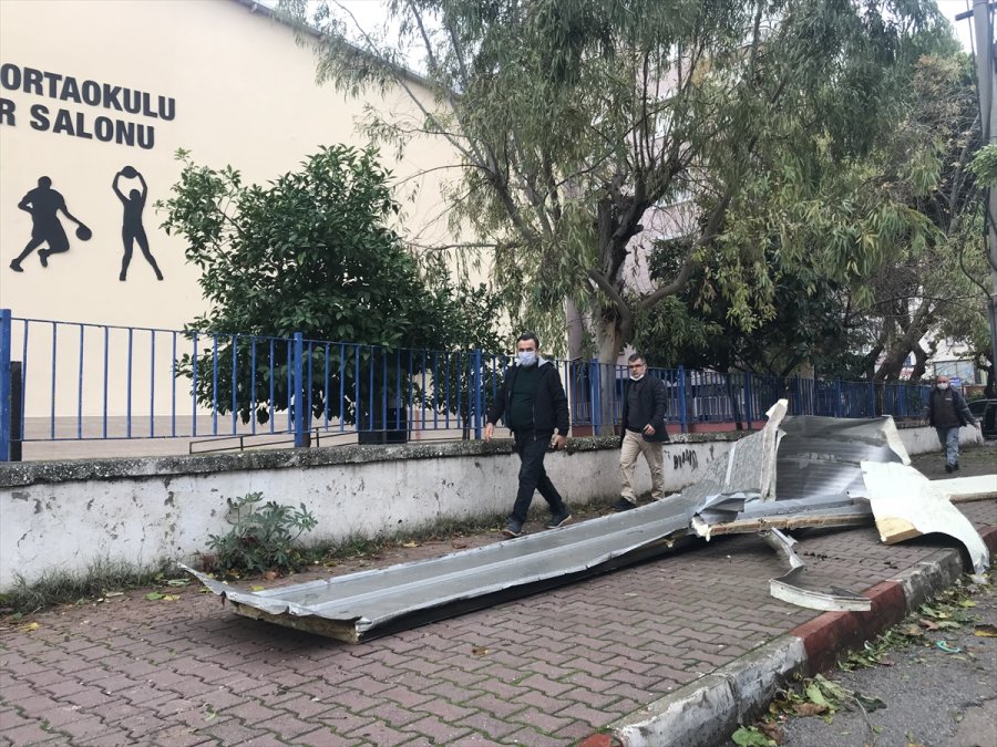 Aralıklarla etkisini sürdüren kuvvetli fırtına nedeniyle Yıldız Mahallesi'ndeki Fatih Ortaokulunda spor salonunun çatısı zarar gördü.