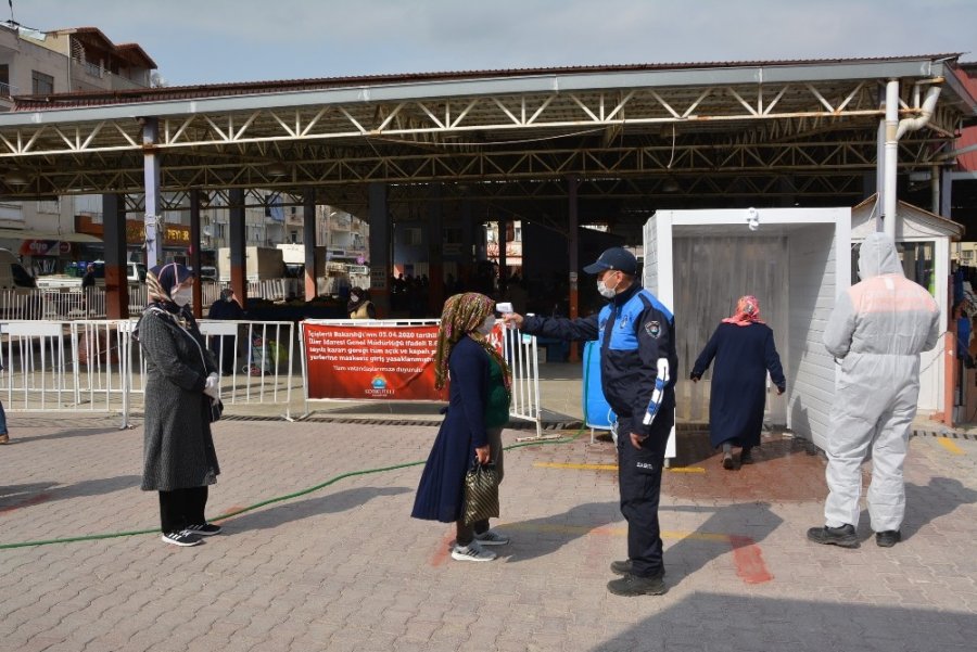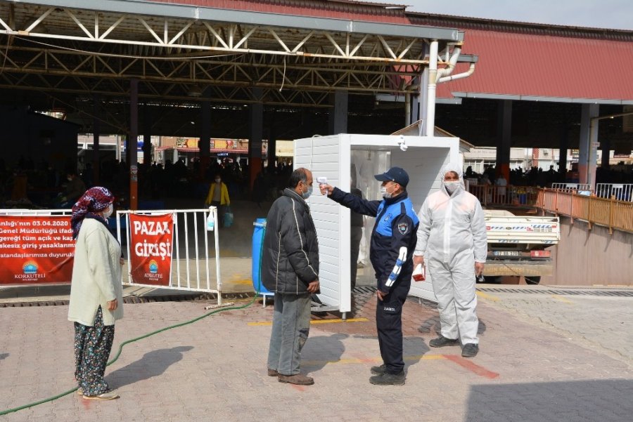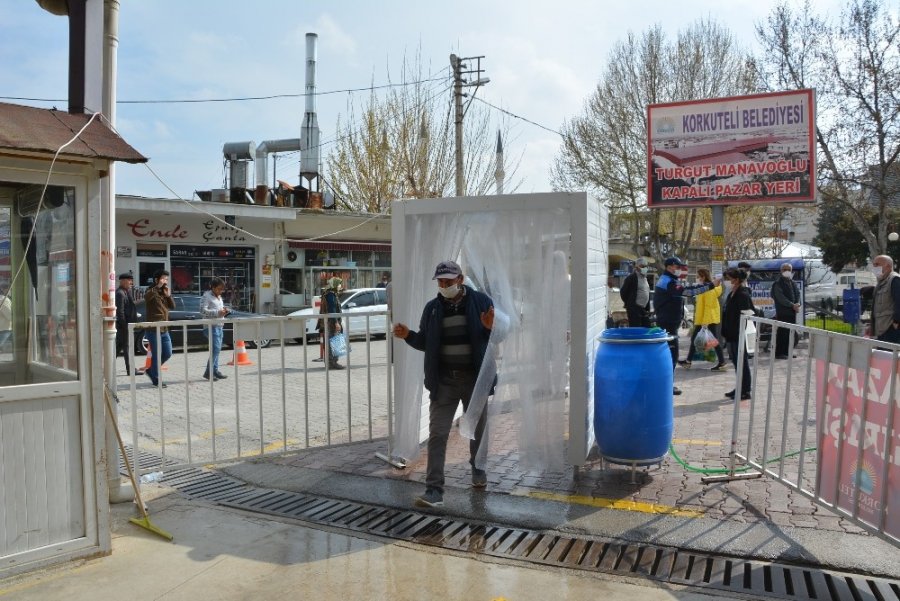 Korkuteli Belediyesi Zabıta ekipleri tarafından vatandaşların tek tek ateşini kontrol ederken, dezenfeksiyon tünelinden geçilerek girilen pazar girişinde sosyal mesafe uygulaması ve toplu giriş yaptırılmaması sebebiyle yaklaşık 1 kilometrelik kuyruk oluştu. Girişte ateşleri ölçülen vatandaşlar, belediyenin kurduğu dezenfeksiyon tünelinden geçtikten sonra içeri alındı.
