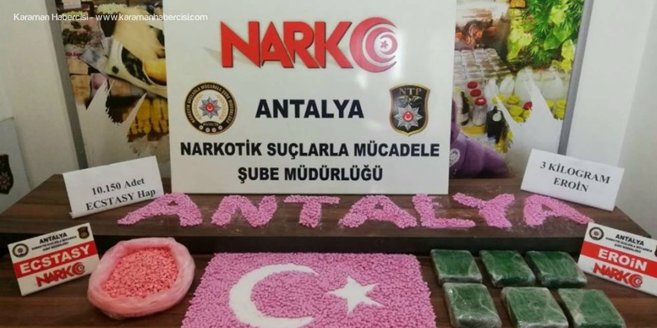 Edinilen bilgiye göre, İstanbul'dan araç ile Antalya'ya gelen A.K. ve N.K.'nin bulunduğu araç, Burdur yolu Döşemealtı Bölge Trafik kavşağında durduruldu. Araçta arama yapan görevliler, aracın ön ve arka koltuğu arasına gizlenmiş, üzeri yorgan ile örtülü çanta içerisinde, şeffaf naylon poşetler içerisinde toplam 10 bin 150 adet ecstasy hap ile aynı çanta içerisinde streç naylonlara sarılı 6 paket halinde toplam 3 kilo eroin maddesi ele geçirdi.