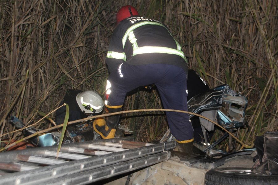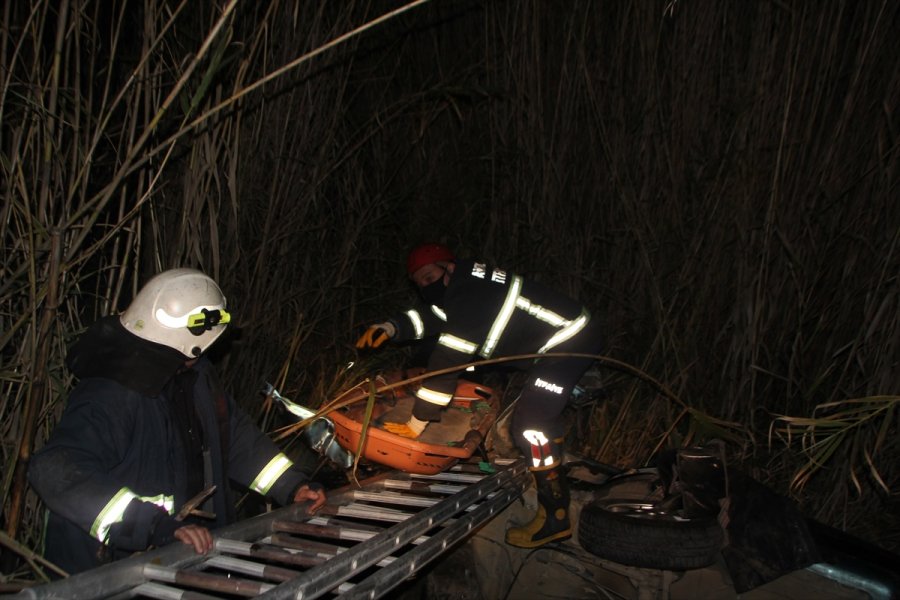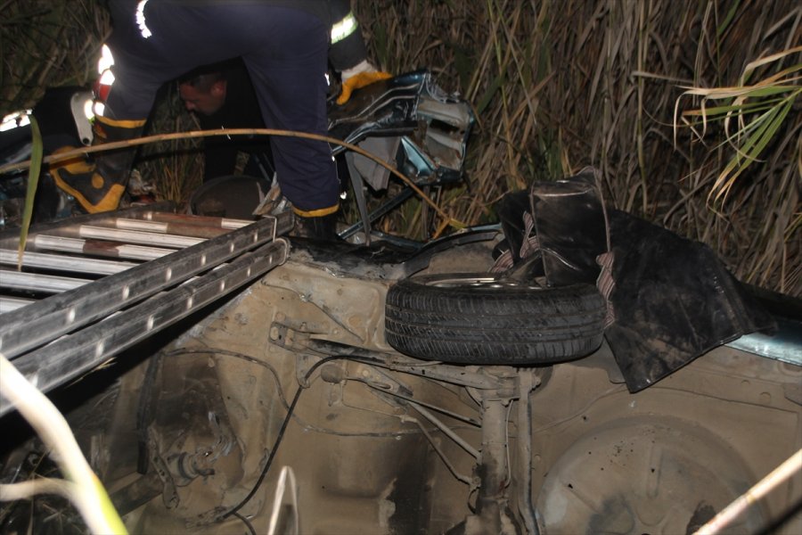 Çarpışmanın etkisiyle savrulan 07 ANJ 366 plakalı otomobil yol kenarındaki sulama kanalına devrildi.