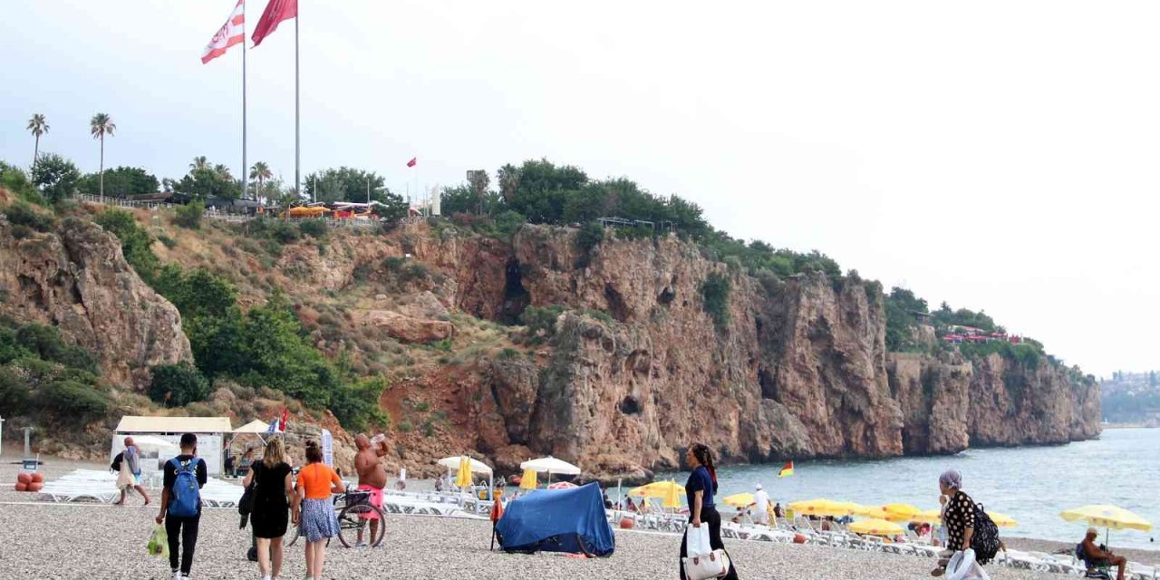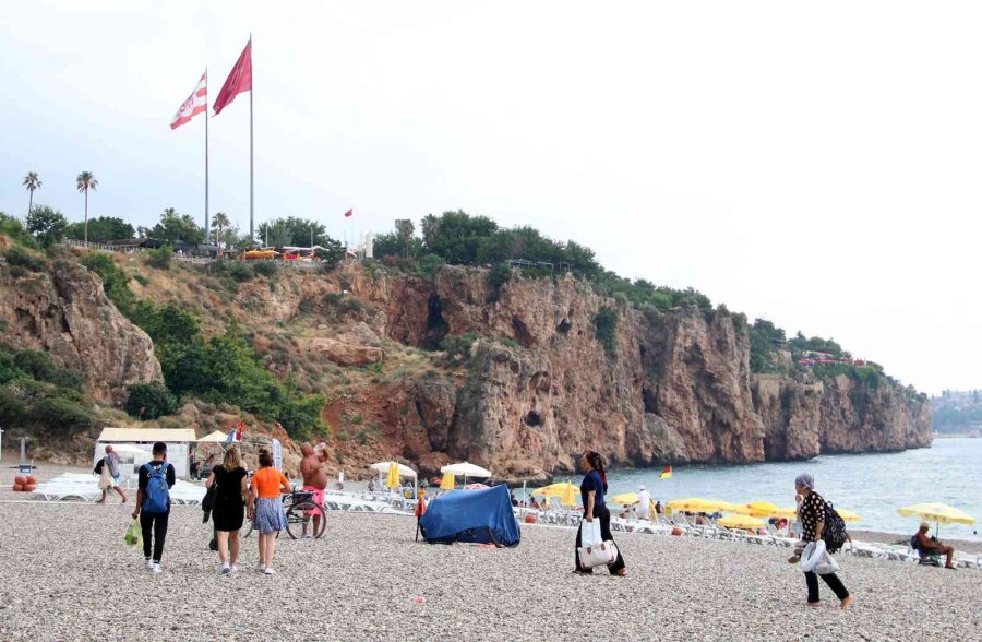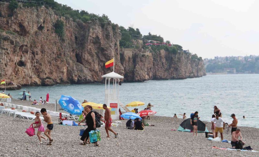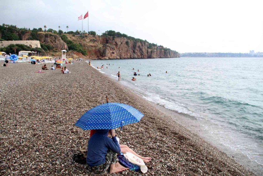 Antalya'da aniden bastıran yaz yağışı havayı serinletti. Yağışla birlikte dünyaca ünlü Konyaaltı Sahili ıssızlaştı.