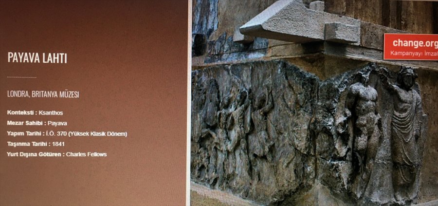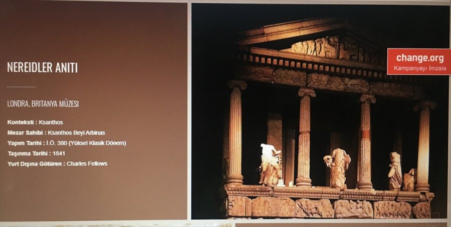 "Eserler Evinde Güzel" kampanyasıyla Ksanthos Antik Kenti'nden götürülen "Nereidler Anıtı", "Harpy Anıtı", "Payava Lahdi", "Ksanthos F, G, H Anıtı", Trysa (Gölbaşı) Antik Kenti'nden alınan "Trysa Heroonu", Myra Antik Kenti'nden götürülen "Myra Kaya Mezarları'ndan (resimli mezar) bir çocuk kabartması", Perge Antik Kenti'nden alınan "Thyke Heykeli" ve Demre Sion Kilisesi'nden çıkarılan "Sion Definesi ya da Korydalla Hazinesi" tarihi eserlerinin ait olduğu topraklara getirilmesi isteniyor.