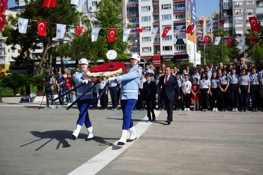 Antalya Büyükşehir Belediyesi, 23 Nisan Ulusal Egemenlik ve Çocuk Bayramı'nı belediye önünde düzenlediği törenle kutladı. Belediye orkestrasının marşlarla eşlik ettiği etkinlikte, Başkan Muhittin Böcek ve Cengiz Topel İlkokulu 4. sınıf öğrencisi Deniz Erdemir, Atatürk Anıtı'na çelenk sundu. Törene çok sayıda çocuk da katıldı. Saygı duruşu ve İstiklal Marşı'nın okunmasının ardından belediye binasına geçildi.