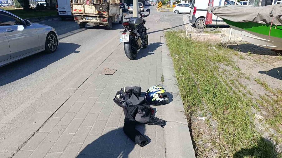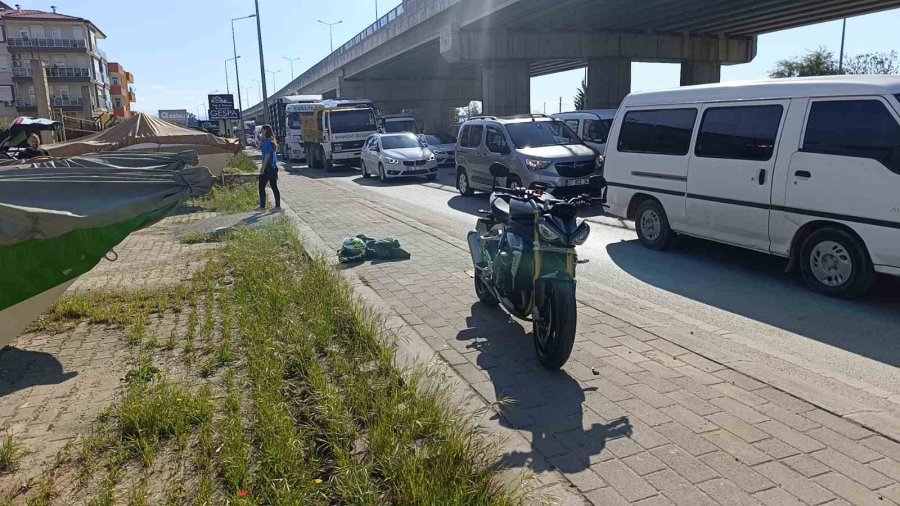 Antalya'da yolda kırmızı ışıkta bekleyen araçların arasından geçerek ilerleyen motosiklet yoldan yaya olarak geçmekte olan vatandaşa çarptı.