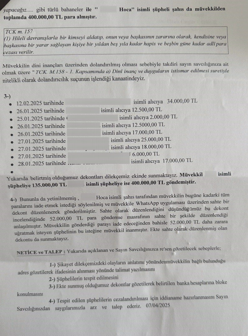 Para gönderilen hesapların büyük ihtimalle kiralık sahte hesaplar olduğunu söyleyen Avukat Ozan Özgür Coruk, "Müvekkilim sosyal medya üzerinden gönül ilişkisi yaşadığı bir kişinin neden kendisi ile sormuş. Daha sonra kendisine bir bağlama büyüsü yapıldığını söylemişler. Bu büyüyü de bozdurabilmek için bir malzeme listesi verilmiş. Kurban parası istenmiş, Afrika'da kuyu açılacağı söylenmiş ve bu şekilde kendisinden de 2025 yılının Ocak ayına kadar 135 bin TL para alınmış. Daha sonra da bu büyünün yanlış olduğu bir başka hoca tarafından dile getirilmiş ve bu şekilde de kendisinden toplamda 400 bin TL daha para istenmiş. 400 bin TL'yi geri iade etmek için ise 52 bin TL masraf olduğu söylenmiş ve bu aşamada müvekkil artık bunların dolandırıcı olduğuna kanaat getirmiş. Müvekkilimin dini inançları üzerinden iradesi sakata uğratılmıştır. Bu suç tipi Türk Ceza Kanunu'nun 158. Maddesi'nde düzenlenmiş olan nitelikli dolandırıcılık suçunu oluşturmaktadır. Müvekkilimin para gönderdiği hesaplar da bu kişiler adına kayıtlı değil. Yüksek ihtimalle bu kiralık hesap dediğimiz bilişim suçlarında kullanılan hesaplara ait. Bu hesap sahipleri çok ağır cezalar almaktadır. Farklı ceza mahkemelerinde yargılanıp onlarca mahkemeden 50-100 yıl gibi cezalar alabilmektedir. Biz bu konuda bilişim savcılığına şikayette bulunduk. Birimler konu ile ilgili olağanüstü çalışmalar yapmaktaysa da bazen bu suçlular maalesef yakalanamamaktadır. Vatandaşlarımızın bu konuda dikkatli olmalarını tavsiye ediyoruz. Mümkün mertebe böyle bir olayda avukattan yardım istemelerini tavsiye ederiz" dedi.