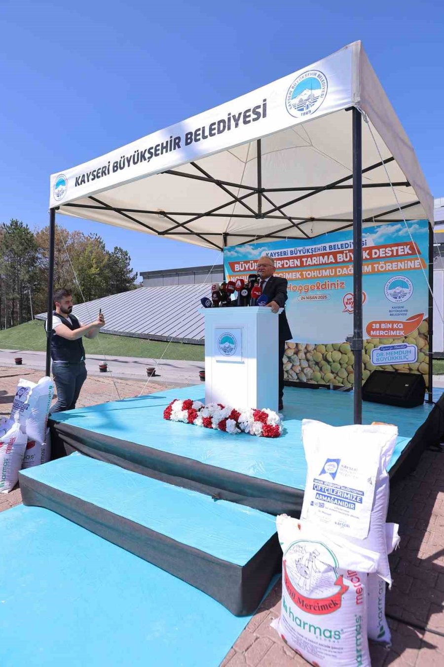 Kayseri Büyükşehir Belediye Başkanı Dr. Memduh Büyükkılıç, Büyükşehir Belediyesi'nin tarımsal kalkınma için gerçekleştirdiği proje kapsamında üreticilere dağıtılmak üzere 11,5 milyon TL maliyetli 200 ton nohut ve 38 ton mercimek olmak üzere toplam 238 ton tohum dağıtım törenine katıldı.