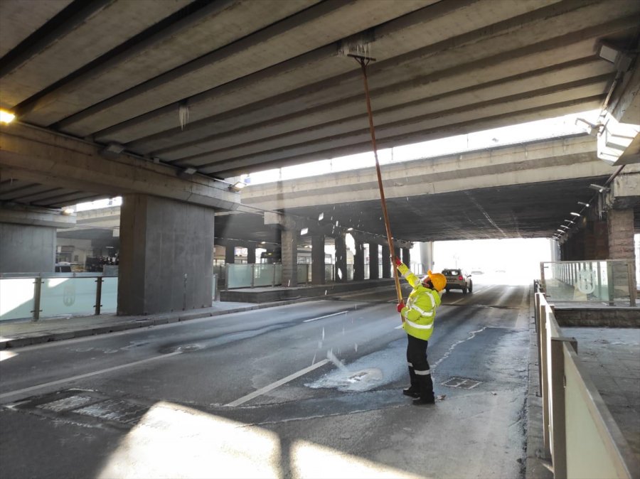 Ekipler, özellikle köprü altları ve tünellerde sürüş güvenliğini olumsuz etkileyen ve can güvenliği riski oluşturan buz sarkıtlarını trafiği aksatmadan kontrollü temizliyor.