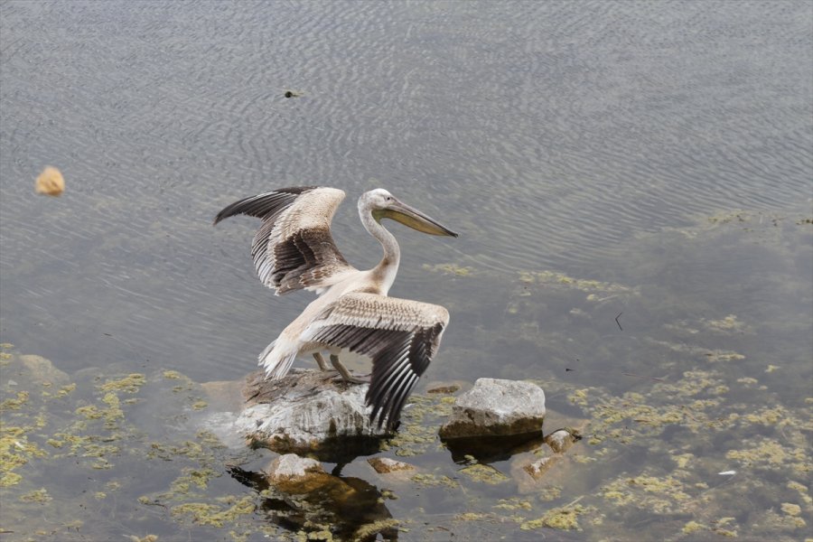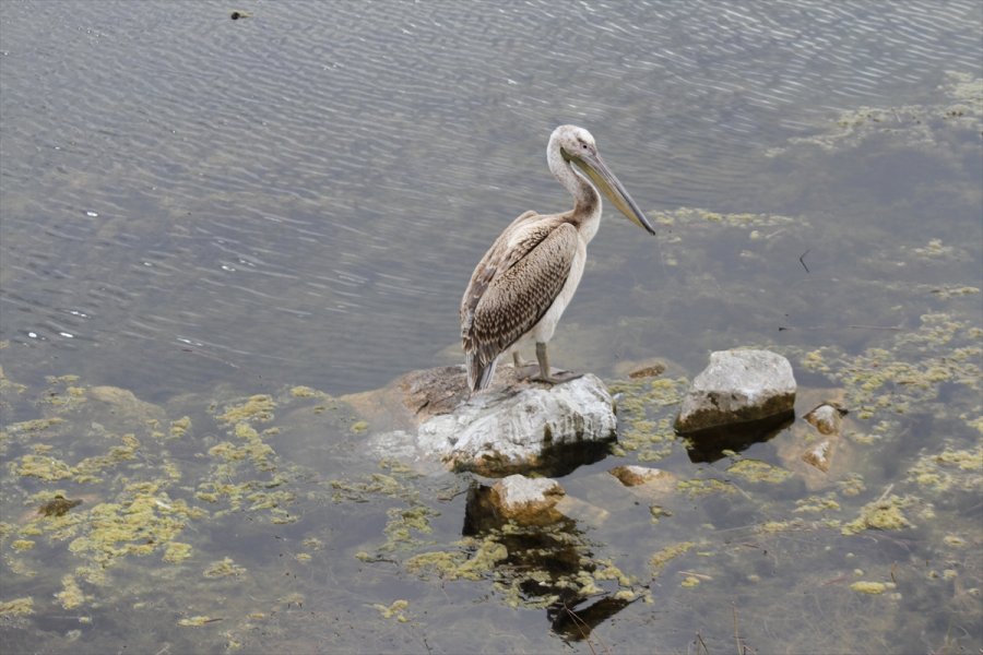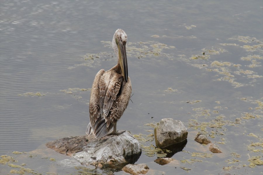 Göl sularına gün boyu gagasını sürekli daldırarak kolaylıkla avladığı balıklarla beslenen pelikan, zaman zaman kıyıdaki bir taşın üzerine çıkarak burada istirahat edip güneşleniyor.