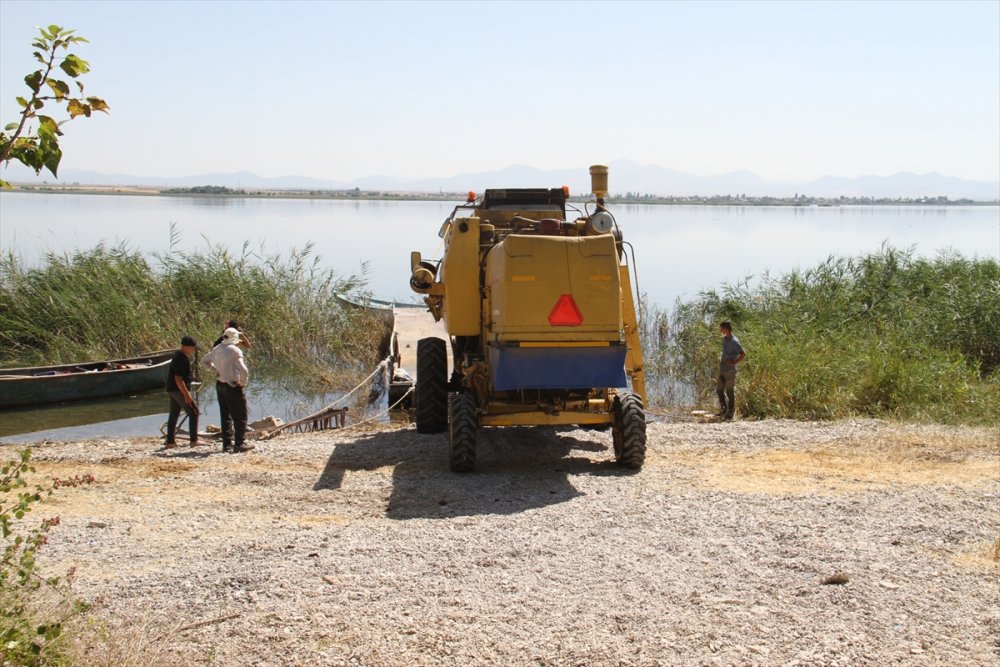 Ürünlerin olgunlaşmasının ardından hasat faaliyetinde kullanılmak üzere bu yıl da duba üzerine yerleştirilen biçerdöver, gölde yüzdürülerek adaya çıkarıldı.