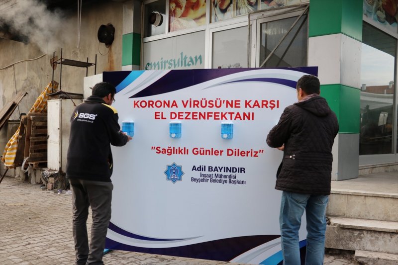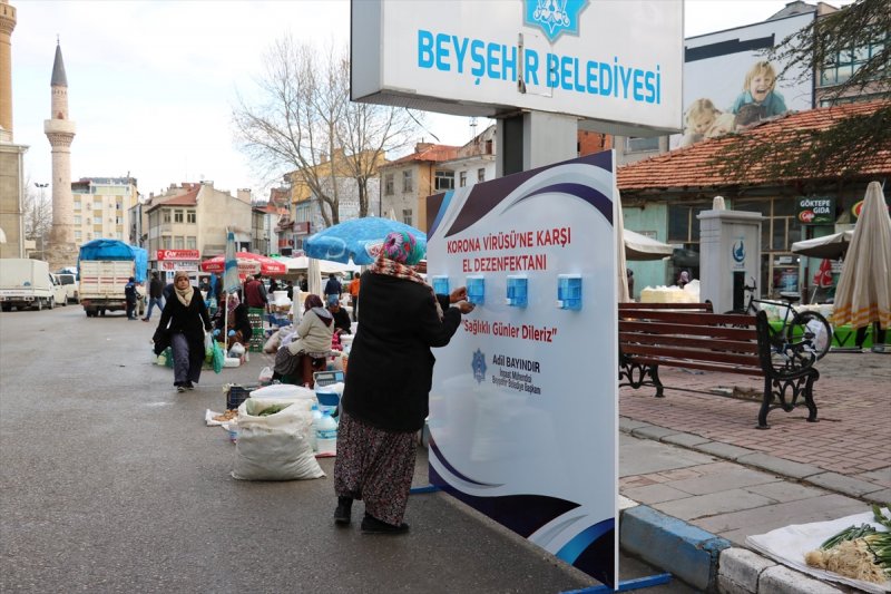 Konya'nın Beyşehir ilçesindeki pazar yerinde, yeni tip koronavirüse (Kovid-19) karşı önlem almak amacıyla dezenfekte standı kurulduğu bildirildi.