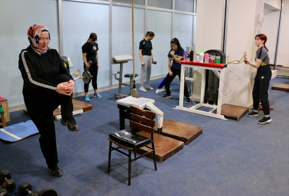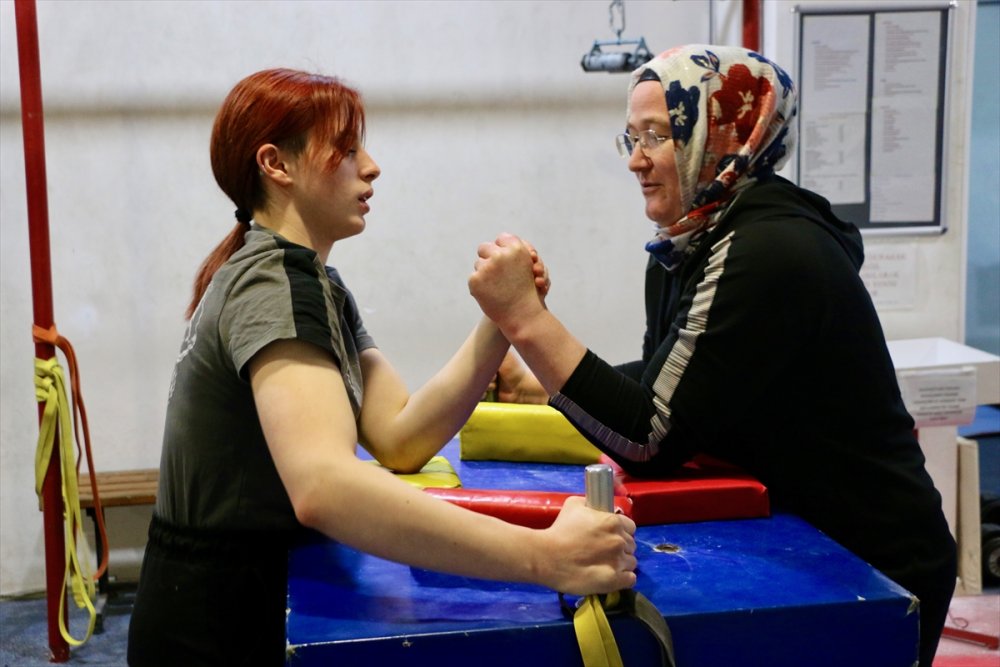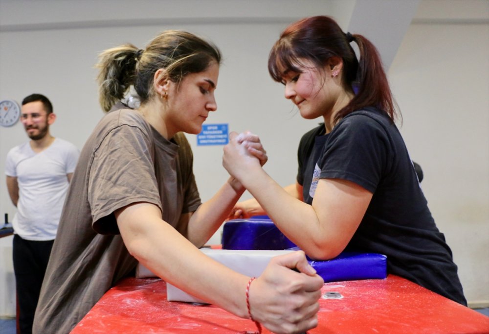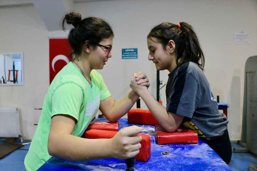 Kadın bilek güreşçiler, Şehit Anıl Gül Spor Salonu'nda milli sporcu Evren Serhat Arslan tarafından haftanın 5 günü gerçekleştirilen antrenmanlarda şampiyonalara hazırlanıyor.