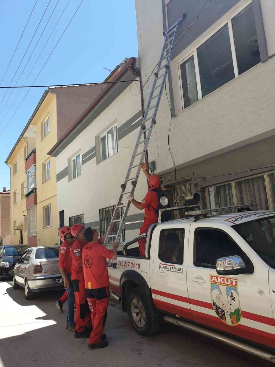 Eskişehir'de AKUT arama kurtarma ekipleri 2 saat süren operasyonla bir binanın ikinci katındaki evin penceresinde mahsur kalan kediyi kurtardı.