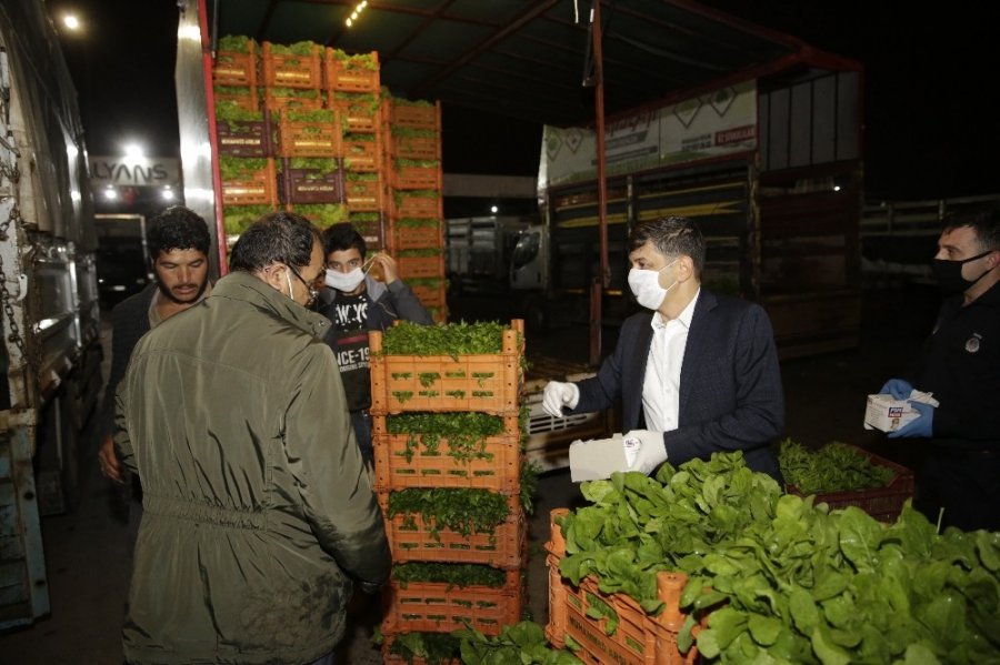 Hale girişlerin başladığı sabah 04.30'da Antalya'nın ilçelerinden gelen binlerce sebze üreticisinin hal kapısında ateş kontrolleri yapılırken, maske takma zorunluluğu olan üreticilerin maske ihtiyaçları karşılandı. Maske dağıtımına Antalya Büyükşehir Belediyesi Genel Sekreter Yardımcısı Ramazan Demir ve Antalya Yaş Sebze ve Meyve Komisyoncular Derneği Başkanı Hasan Ali Yılmaz da katıldı.