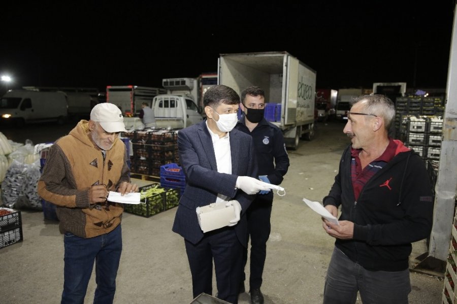 Antalya Büyükşehir Belediyesi, Antalya Toptancı Hal'de üretici ve komisyonculara maske dağıtımı gerçekleştirdi.