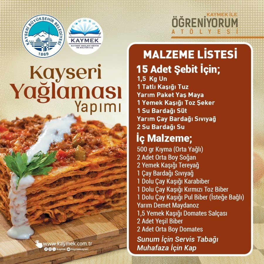 Kayseri'yi ve sahip olduğu zengin kültürel değerlerini her platformda tanıtmaya ve desteklemeye gayret gösteren Büyükşehir Belediye Başkanı Dr. Memduh Büyükkılıç yönetimindeki Büyükşehir Belediyesi, öte yandan ailelere yönelik hizmetlerini de sürdürüyor. Bu kapsamda evli çiftlerin bir arada zaman geçirmesine yönelik olarak, Kayseri'nin zengin gastronomi kültürü içerisinde önemli yer tutan Kayseri Yağlaması Yapımı etkinliği düzenleyen Kayseri Mesleki Eğitim ve Kültür A.Ş. (KAYMEK), insanların hayatlarına renk katmaya devam ediyor.