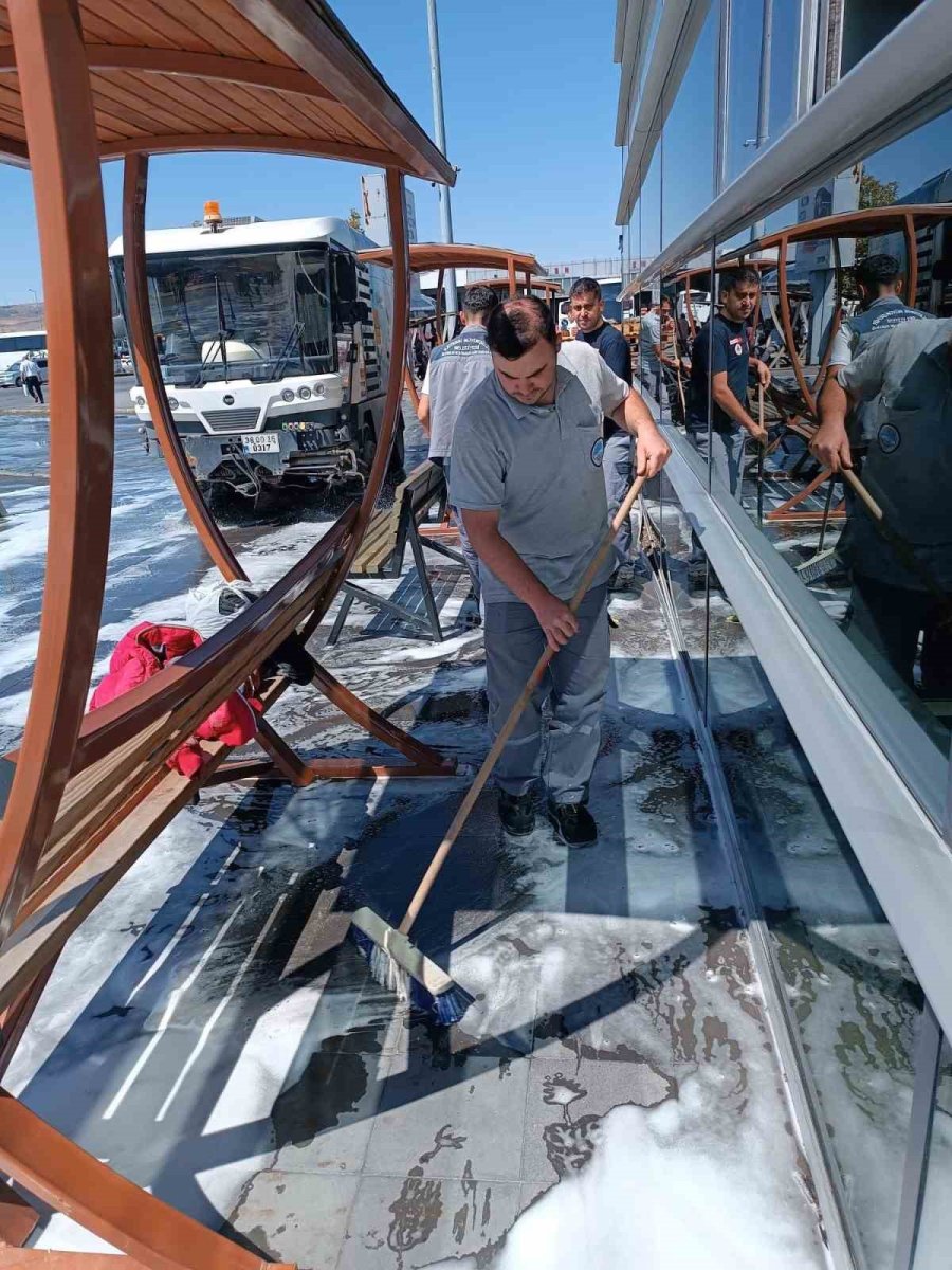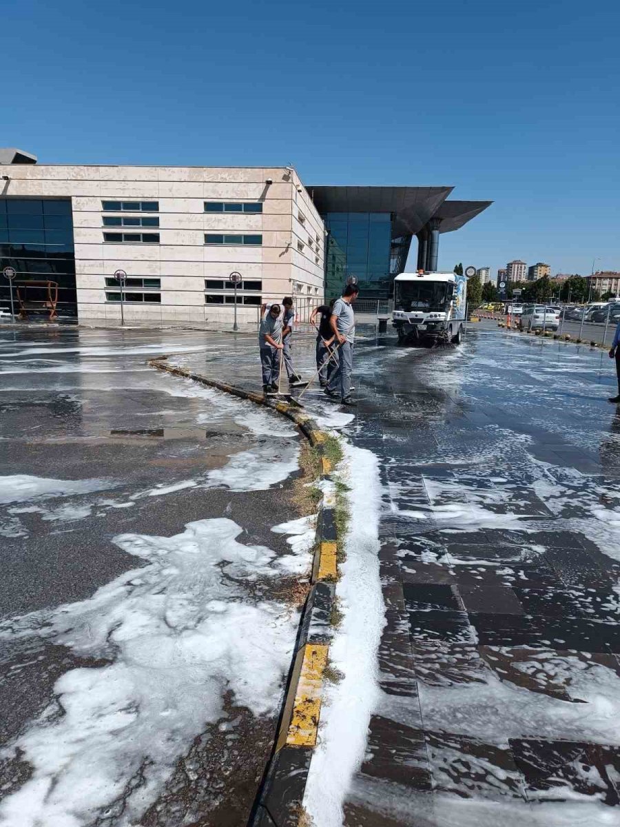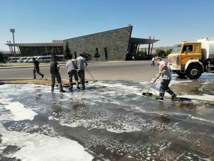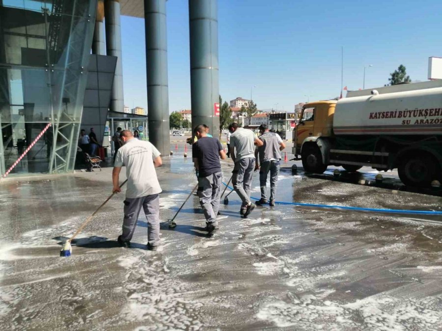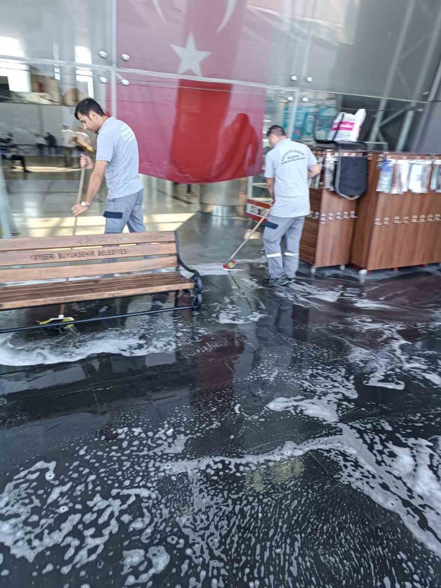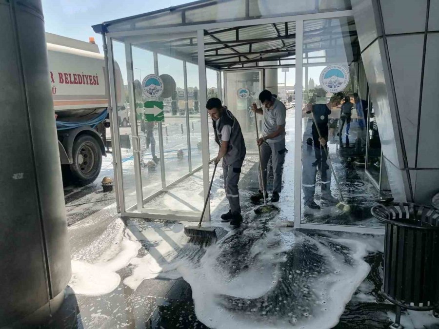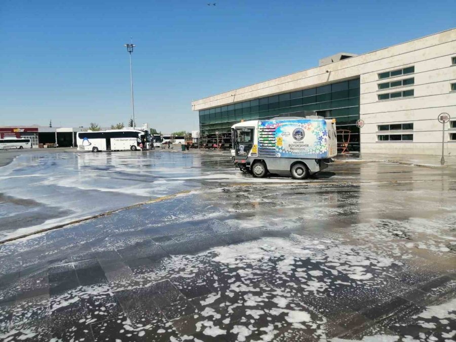 Kayseri Büyükşehir Belediyesi ekipleri tarafından Şehirlerarası Otobüs Terminali çevresinde kapsamlı yıkama ve temizlik çalışması yapıldı.