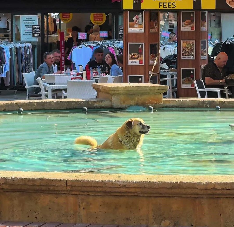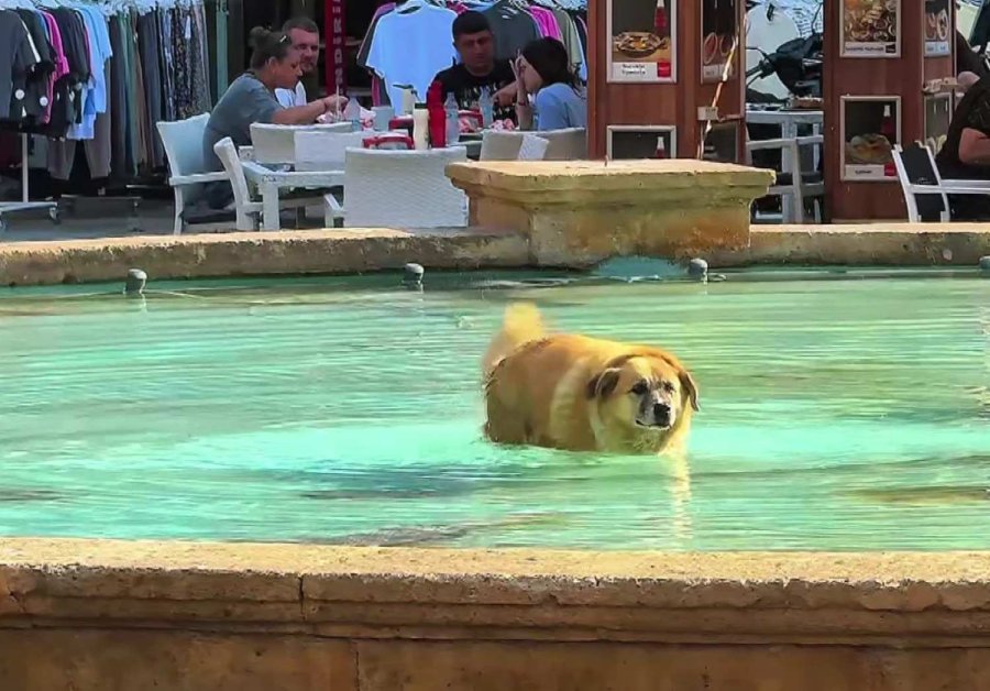 Antalya'nın yaya yoğunluğunun en fazla olduğu Kazım Özalp Caddesi'nde (Kapalıyol) sıcaktan bunalan bir sokak köpeği de süs havuzuna girerek serinlemeye çalıştı. O anlar cep telefonu kamerasına yansıdı.