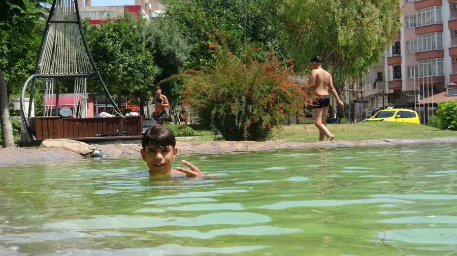 Antalya'da sıcaktan bunalan çocuklar tehlikeye rağmen parklarda bulunan süs havuzlarında serinlemeye çalıştı.