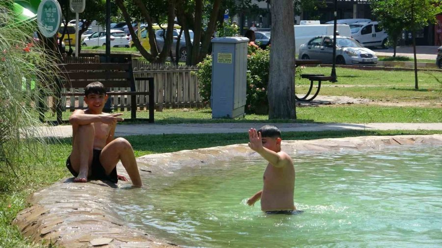 Çocuklar Sıcak Havada Süs Havuzunda Serinledi