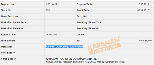 Türk Patent ve Marka Kurumu tarafından Karaman Ticaret ve Sanayi Odası’nın başvurusu kabul edildi ve Divle Peyniri tescillendi
