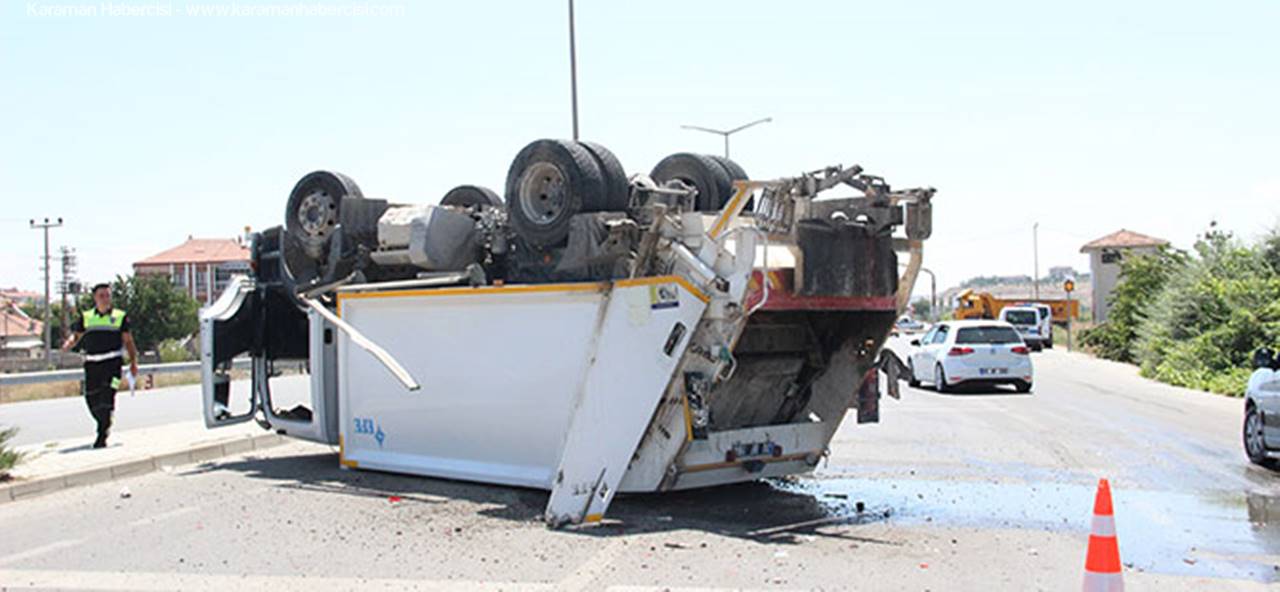 Kaza, öğle saatlerinde Çeltek Mahallesi çevre yolu jandarma kavşağında meydana geldi. Alınan bilgiye göre, Karaman Belediyesine ait Mustafa T. yönetimindeki 70 BF 184 plakalı çöp kamyonu, kavşakta Nejat B. (65) idaresindeki 70 FU 830 plakalı otomobille çarpıştı. Çarpışmanın şiddetiyle kontrolden çıkan çöp kamyonu 100 metre ileride refüjü atladıktan sonra yolun karşı şeridine geçerek devrildi. Kazada kamyon sürücüsü Mustafa T. yaralandı. Çevredeki vatandaşların yardımıyla kamyondan çıkarılan sürücü çağrılan ambulansla kaldırıldığı Karaman Devlet Hastanesinde tedavi altına alındı. Sürücünün sağlık durumunun iyi olduğu öğrenildi.