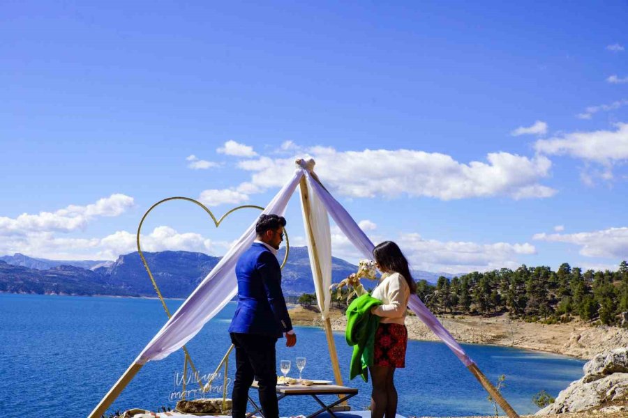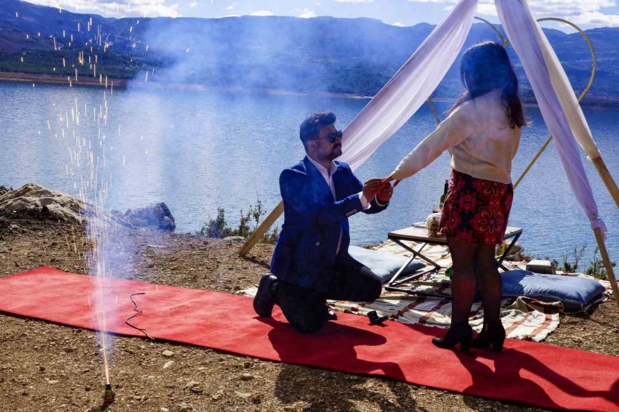 Kahramanmaraş merkezli 6 Şubat'taki depreme Hatay'da nişanlısıyla birlikte yakalanan sınıf öğretmeni Ali Karakoç, deprem nedeniyle nişanlısına yapamadığı evlenme teklifini memleketi Karaman'ın Ermenek ilçesinde buruk bir şekilde de olsa baraj gölü manzarasında gerçekleştirdi.