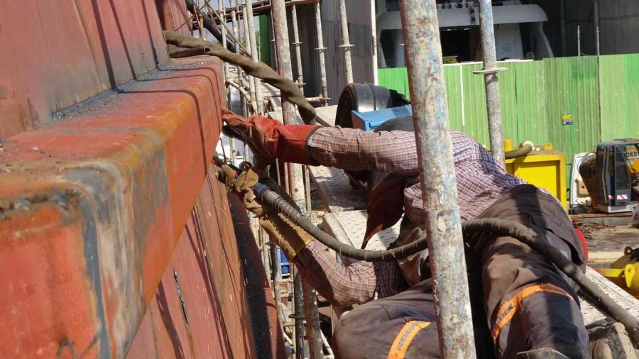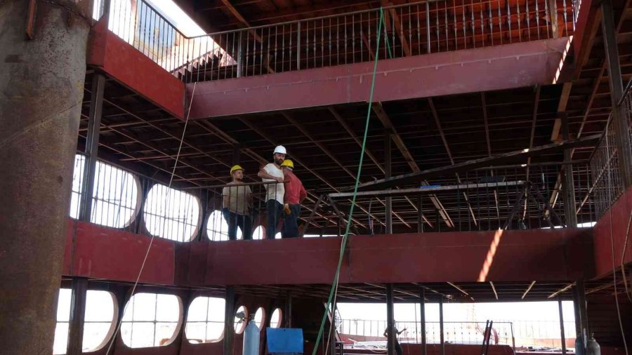 2 yıl önce Manavgat'ta büyük bir gemi inşa ettiklerini ancak geçen sene o geminin yandığını hatırlatan Hasan Çavuşoğlu, "Yanan gemiyi yeniden inşa etmektense daha büyük, daha modern ve gördüğümüz eksikleri de gidererek sıfır bir gemi yapmaya karar verdik. Manavgat'ta bazı imkanlar kısıtlı olduğu için tersane bünyesinde bir alanı kiraladık. O alanda geminin inşasını bütün iş yüküyle kendimiz yapıyoruz. Gemiyi tamamen çelikten yapıyoruz. Şu anda karkası yürüyüş takımlarına kadar tamamlandı. Kumlama işleminin ardından boyaya geçeceğiz. Yaklaşık 1 ay sonra suya indireceğiz. Suya indirdikten sonra içini de yapacağız. Geminin içini tamamen deri ve ahşapla kapatacağız. İnsanlar çelik olup olmadığını bile anlamayacak. Misafirlerimizin rahat etmesi için geminin içine asansör sistemi dahi koyduk" dedi.
