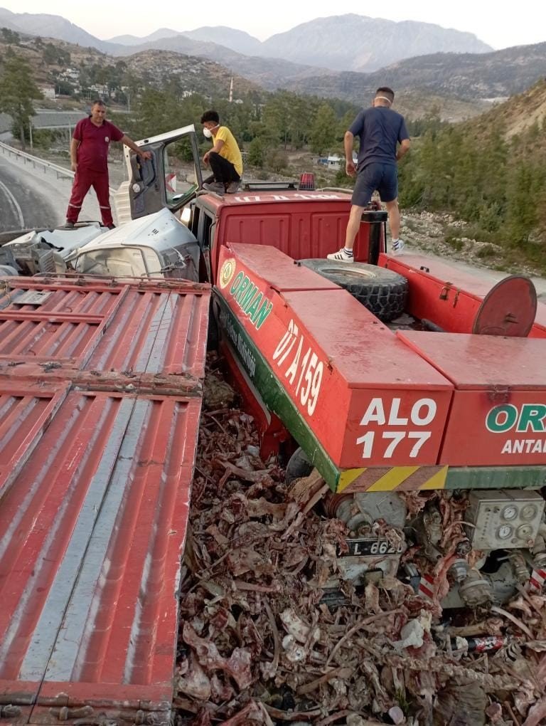 Antalya'nın Manavgat ilçesinde devrilen kamyonun park halindeki arazöz ve otomobile çarpması sonucu meydana gelen kazada 1 kişi yaralandı.
