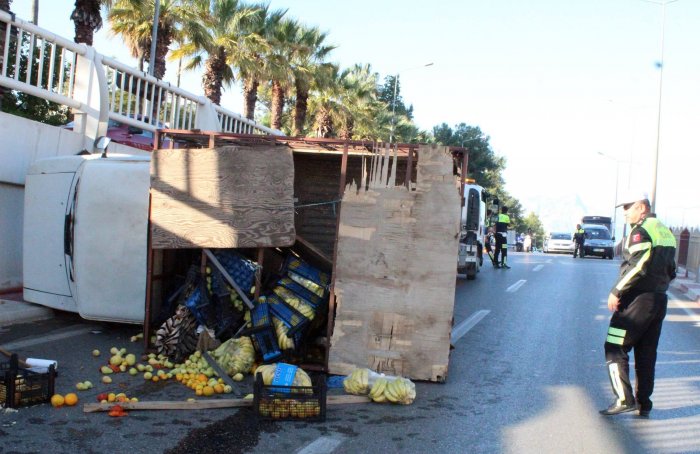 Antalya’da meyve yüklü pazarcı kamyoneti alt geçitte devrildi. Kazayı yara almadan atlatan sürücü, ekmek teknesinin zarar görmesi nedeniyle büyük üzüntü yaşadı.
