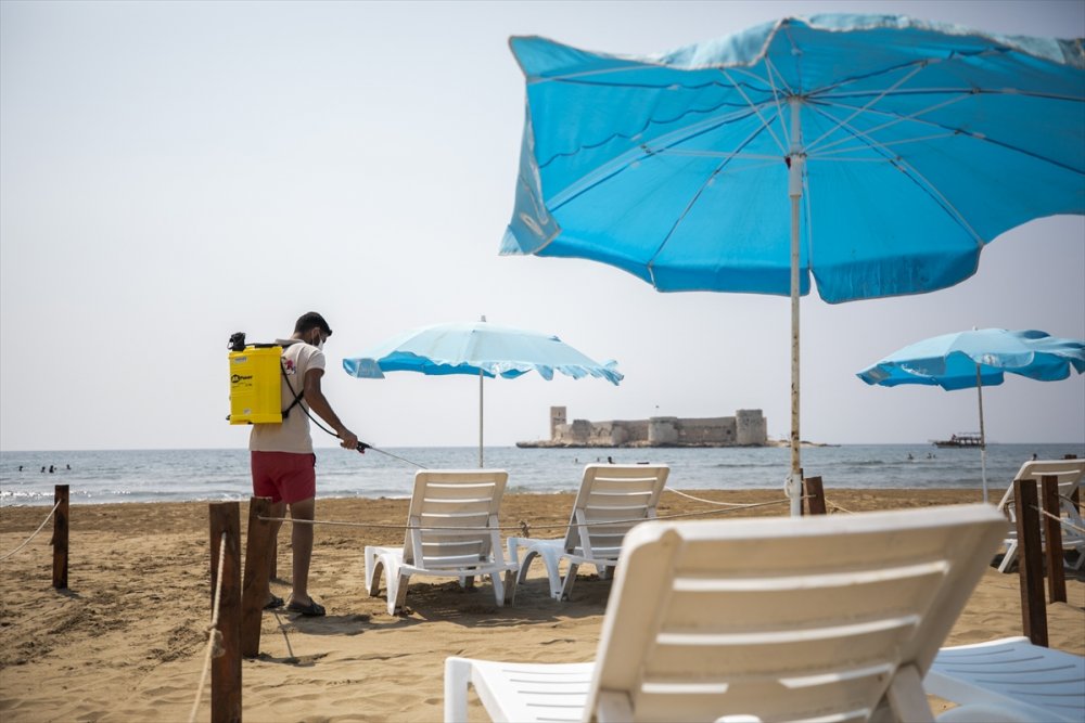 Ekiplerin, 2'şer şezlong ve bir şemsiye yerleştirdiği alanların çevresi dezenfekte ediliyor.