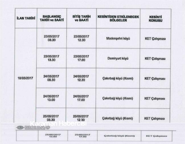 Medaş İşletme Müdürlüğünden yapılan yazılı açıklamada; "Karaman 2 İşletmesi sorumluluk alanı içersinde yer alan aşağıda bilgileri belirtilen bölgelerde yapılacak çalışmalar nedeniyle programlı elektrik kesintisi yapılacaktır.