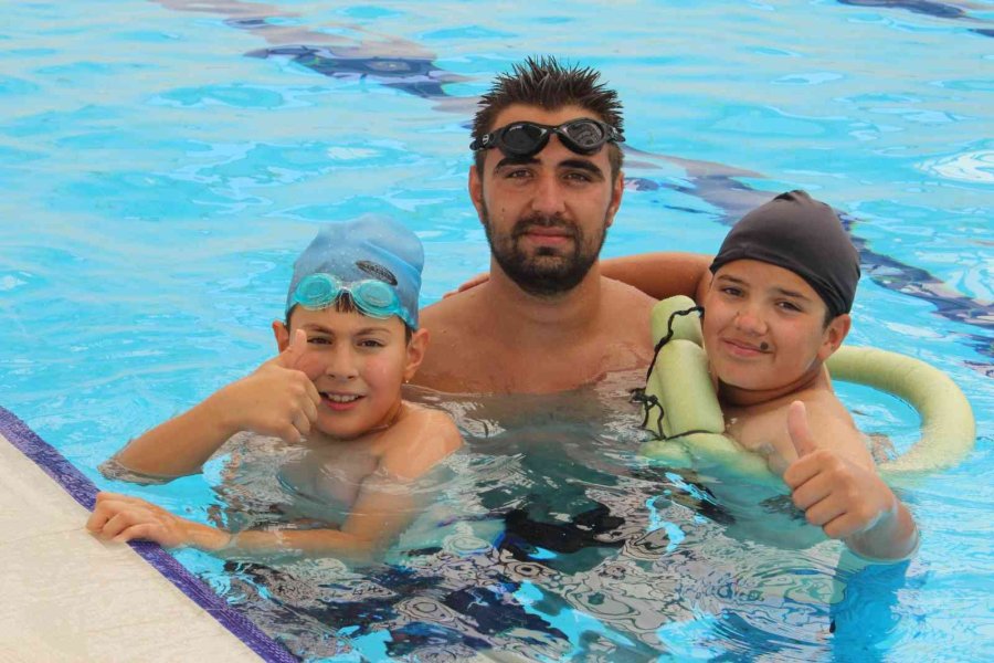 Elmalı’da Çocuklar Hem Yüzme Öğreniyor Hem De Serinliyor