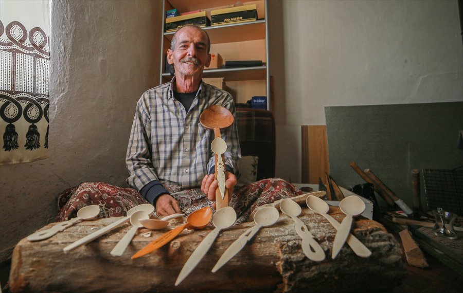 Antalya'nın Akseki ilçesinde evinin bir odasını atölyeye çeviren 68 yaşındaki emekli öğretmen Mustafa Bütüner, babasından öğrendiği unutulmaya yüz tutan tahta kaşık zanaatını sürdürüyor