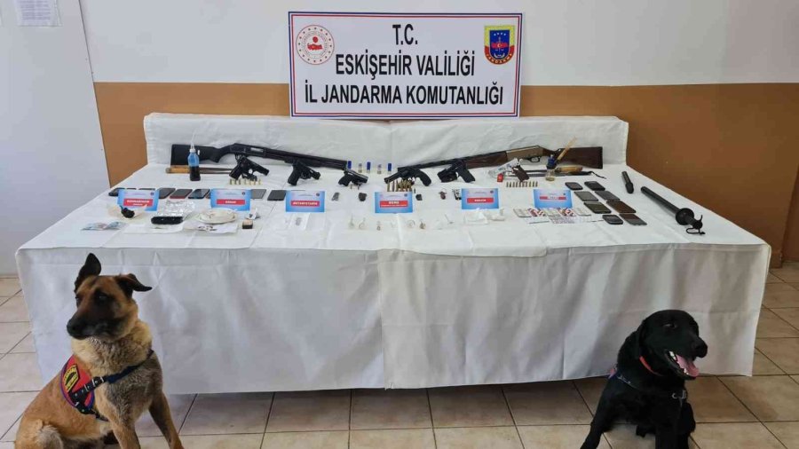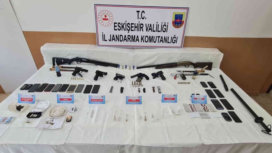 150 Jandarma personeli ve Narkotik Köpek Timleri'nin katılımı ile yapılan aramalarda; 175 gram metamfetamin, 160 gram bonzai, 5 gram kokain, 171 adet sentetik uyuşturucu hap, 7 kök ekili kenevir bitkisi, 3 adet uyuşturucu satışında kullanılan hassas terazi, 33 adet uyuşturucu kullanma aparatı, 3 adet ruhsatsız tabanca, 17 adet 9 mm çapında tabanca mermisi, 3 adet kuru-sıkı tabanca ve bu tabancaya ait 31 adet mermi, 2 adet ruhsatsız av tüfeği ve 5 adet fişek, 4 adet pala, 6 adet sustalı ve kelebek tabir edilen bıçak ile 2 adet jop ve 19 adet cep telefonu ele geçirildi.