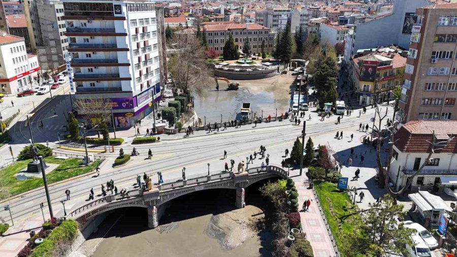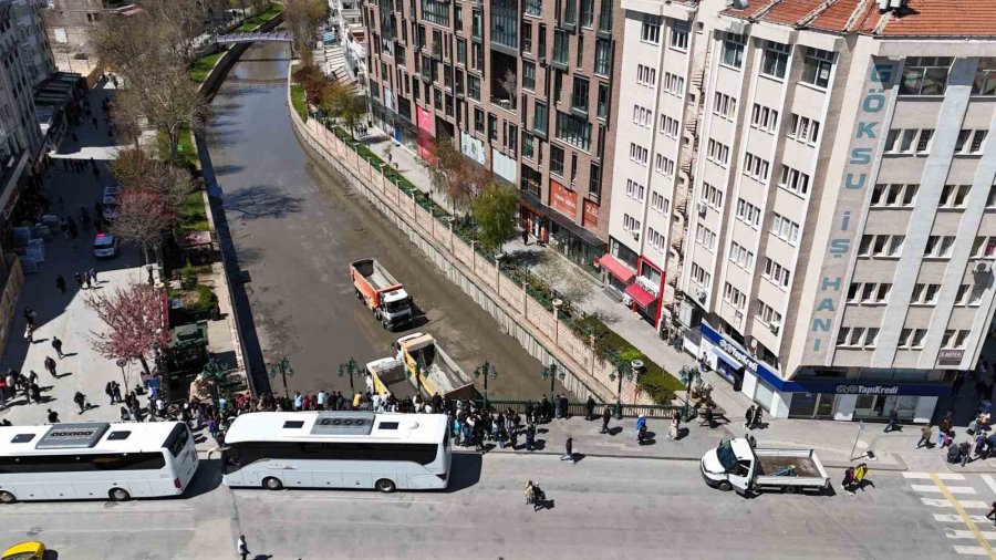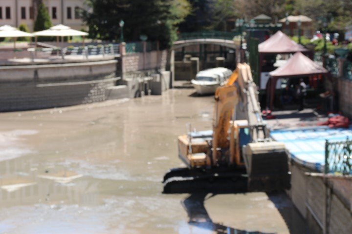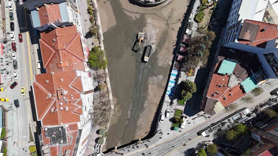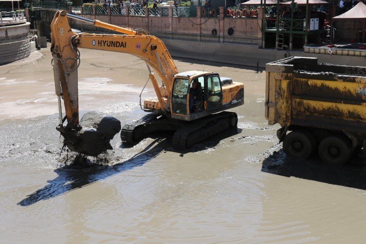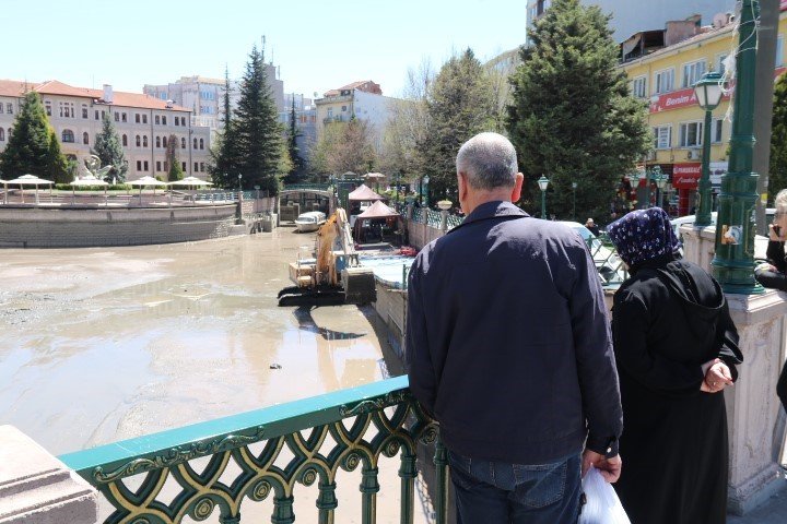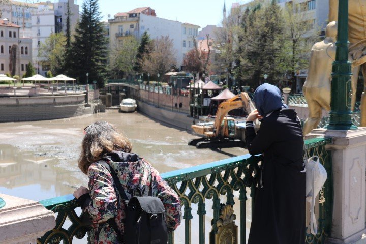 Porsuk Çayı'nın suyu kesilerek Eskişehir kent merkezinden geçen kısmında ekskavatör ve kamyonlarla yapılan temizlik çalışmaları ilgi ile izlenirken, temizlikten habersiz Porsuk Çayı'nı görmek için Eskişehir'e gelen turistler şaşkınlık yaşadı.