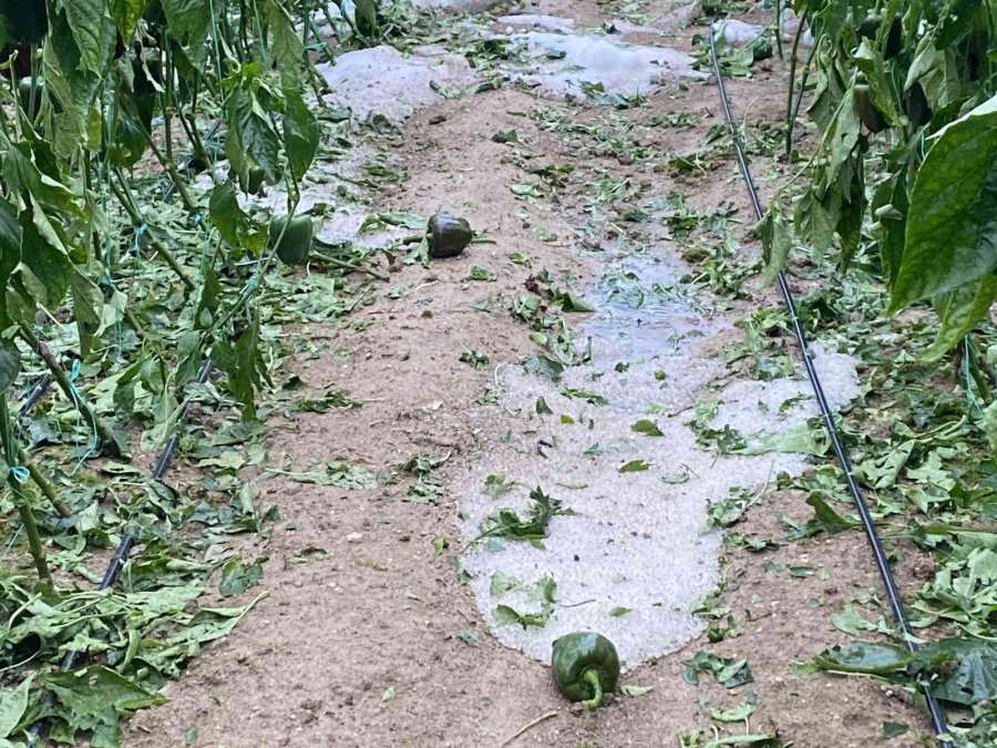 Kurşunlu Mahallesi'nde üreticilik yapan Bahattin Cihan, 15 dakika yağan dolunun seralarında büyük hasar meydana getirdiğini ve ürünlerin kullanılmaz hale geldiğini belirtti. Cihan, "Buradaki derenin dolmasından dolayı gece 21.00'de su seramıza hareket ederek seranın içine geldi. 3 dönümlük sera alanımıza zarar verdi. Burada ki dere temizlenirse bu olayda belki de önlenmiş olacak; ilgili kişilere seslenmek istiyorum, bu derenin yıllık temizlenmesi için gereken neyse yapılmasını istiyoruz. Sera alanımız toplam 13 dekar ve burada Kaliforniya biber ekiyoruz. Her sene bu dere taşmakta ve bu olay meydana geliyor. Dolu yağışı 15 dakika sürdü. Seranın olukları dahi doldu. Yan tarafımızda ki seranın oluklarının dolu ile birikmesi sonucu naylonlarını da yırttı, oluklarını göçertti. Şuan da tam olarak hasar tespit yapamadık ama 3 dönümlük yerimizi su bastı. Hasat zamanı böyle bir olay oldu" dedi.