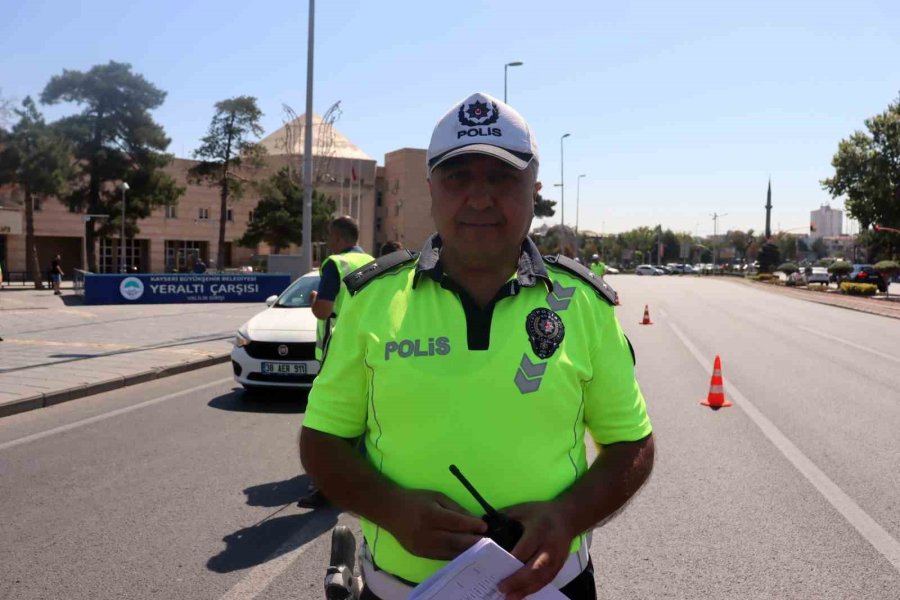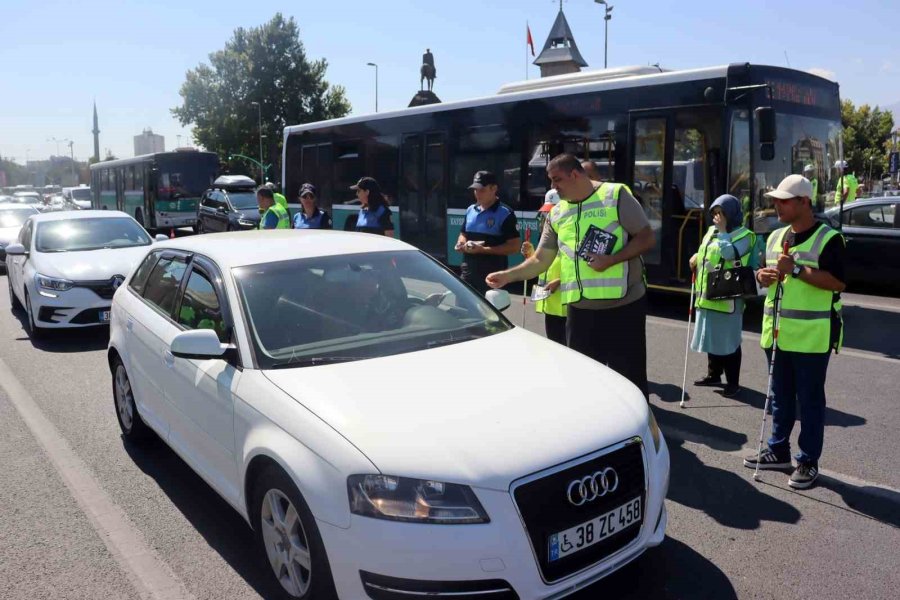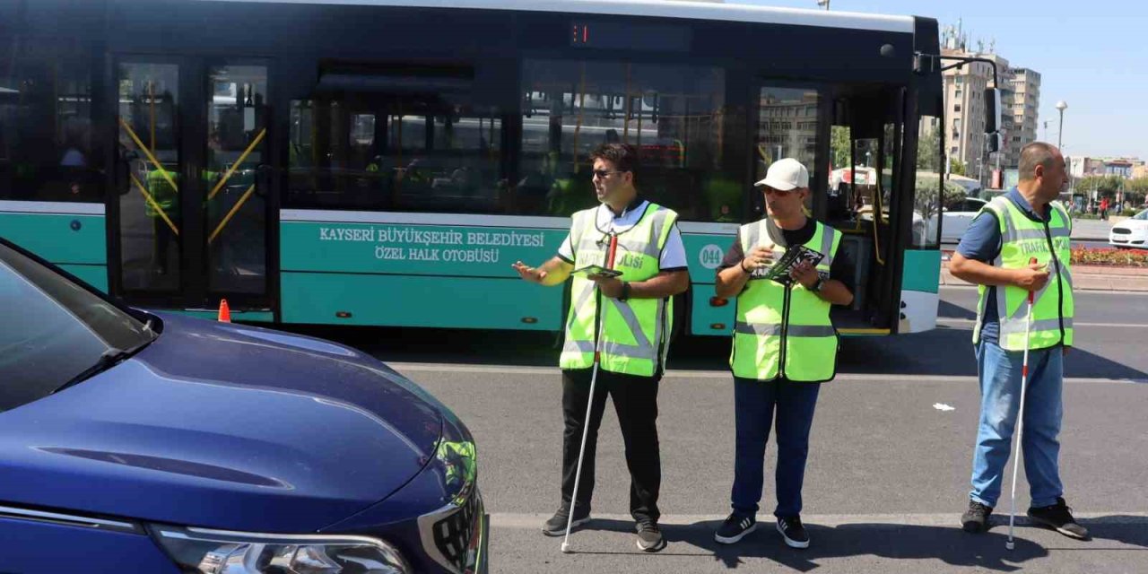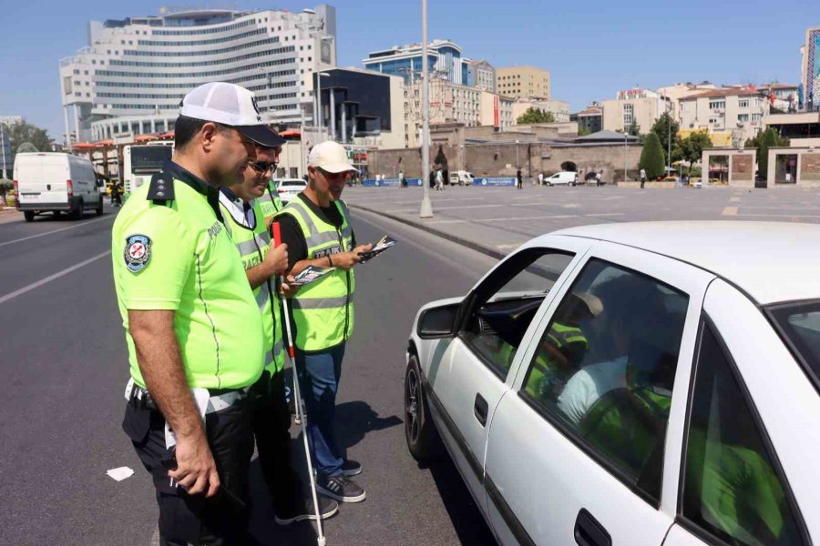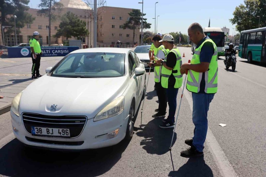 Kayseri'de trafik polisleri ile beraber trafik denetimine katılan görme engelli vatandaşlar, beyaz bastona dikkat çekti.