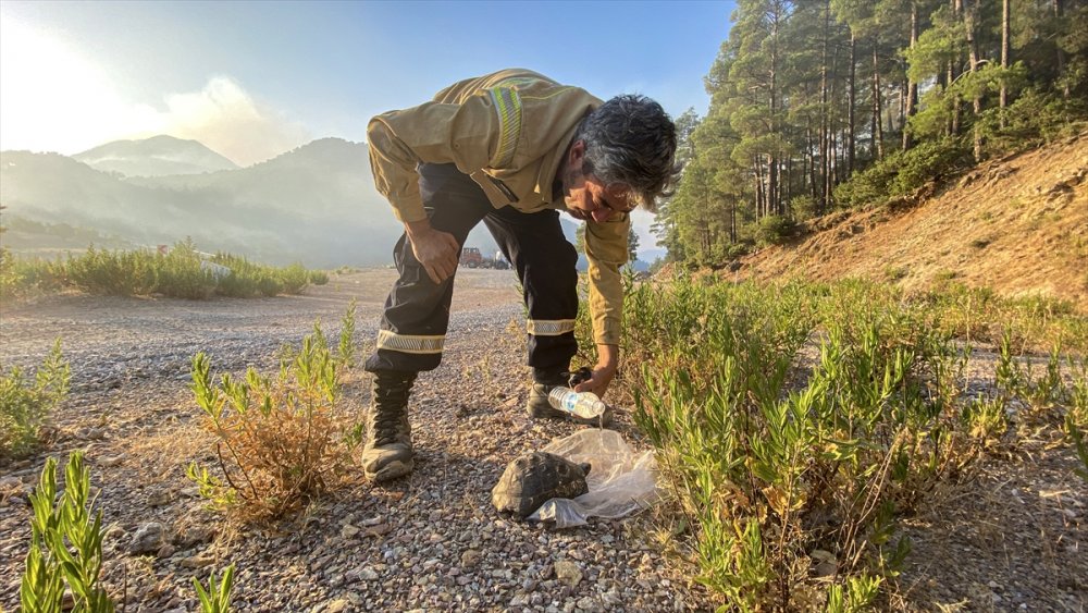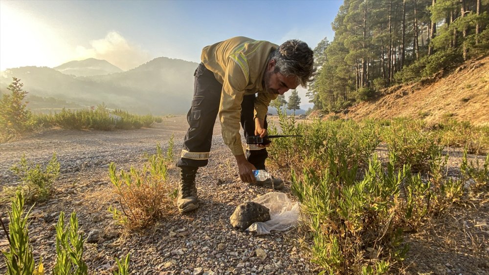 Antalya'nın Gündoğmuş ilçesinde süren orman yangınında mahsur kalan kaplumbağayı orman işçileri kurtardı.