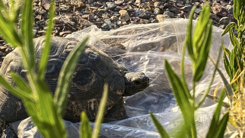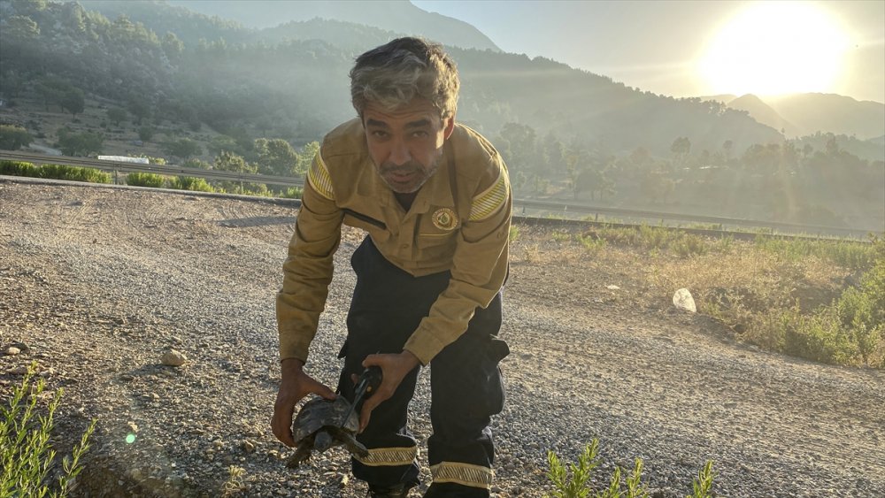 Sabah saatlerinde alevlerden kaçarak yol güzergahından ilerlemeye çalışan bir kaplumbağa Gündoğmuş Orman İşletme Müdürlüğü Şefi Ender Erol'un dikkatini çekti.