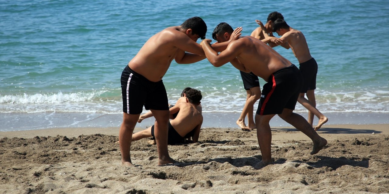 Mersin'de Güreşçiler, Sahilde Antrenman Yaparak Turnuvalara Hazırlanıyor