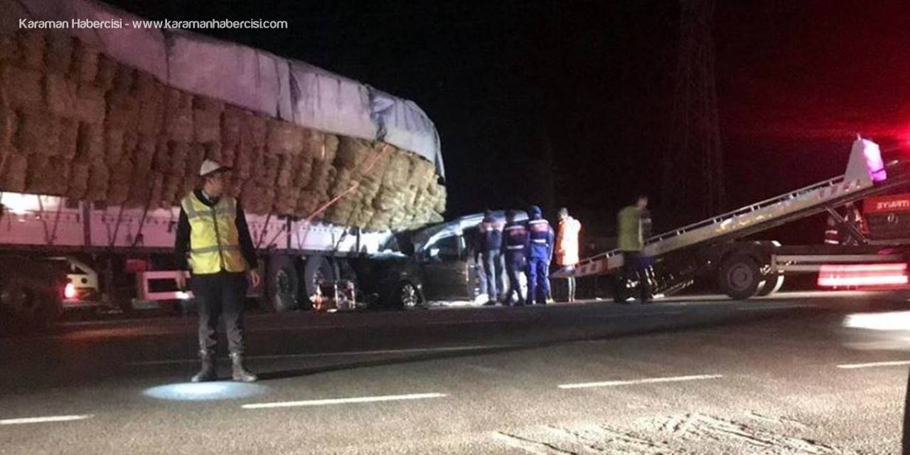 Edinilen bilgiye göre, Ankara'da gittikleri doktordan Kulu ilçesine dönen Zeki Kara (57) idaresindeki 42 GE 520 plakalı hafif ticari araç, sürücüsü ve plakası alınamayan saman yüklü tıra arkadan çarptı. Çarpmanın şiddetiyle sürücü Zeki Kara ile annesi Fatma Kara (78) araçta sıkıştı. Diğer sürücülerin haber vermesi üzerine olay yerine jandarma, polis, sağlık ve itfaiye ekipleri sevk edildi.