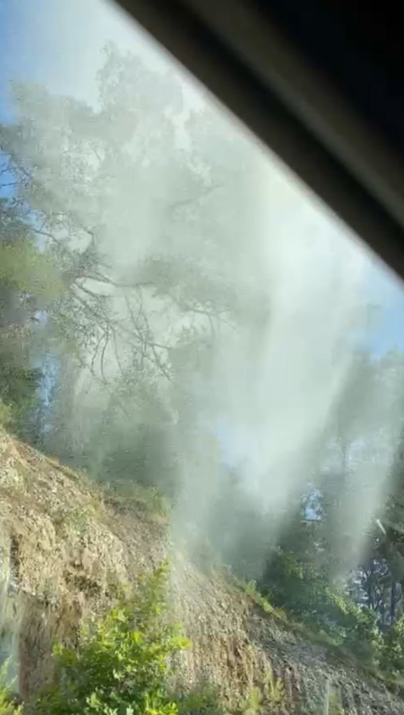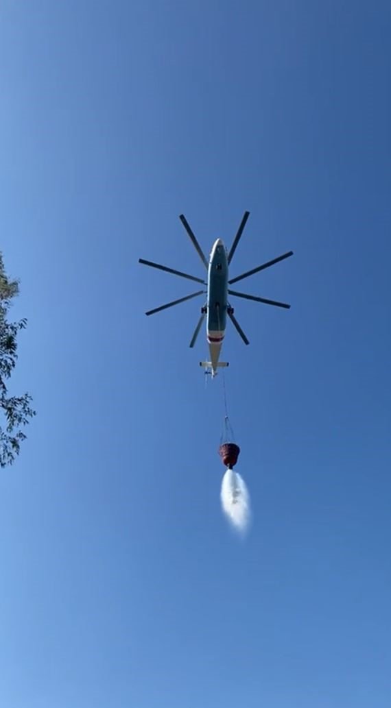 Aksu ilçesinde öğle saatlerinde çıkan orman yangınında 1,8 hektar küle dönerken, bölgede havadan ve karadan soğutma çalışmaları devam ediyor. Çalışmaları yerinde görüntüleyen gazeteciler soğutma çalışması yapan helikopterin bıraktığı tonlarca suyu fark etti. Koşarak araca sığınan gazeteciler ıslanmaktan son anda kıl payı kurtuldu. O anlar cep telefonu kamerasına saniye saniye yansıdı.