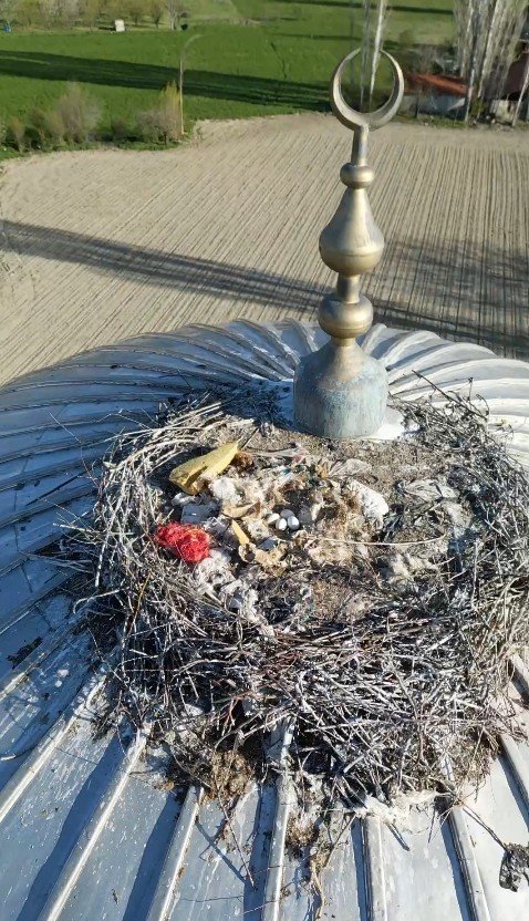 Her Yıl Aynı Caminin Kubbesine Yuva Yapan Leylek Cemaatin İlgi Odağı Oldu
