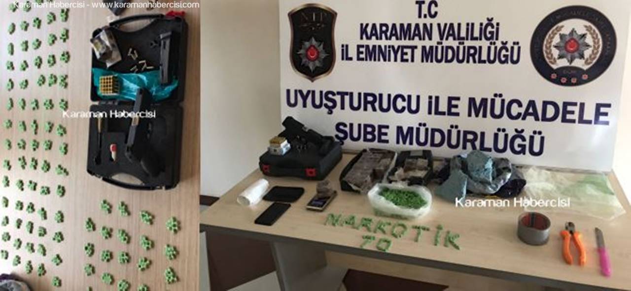 Mustafa K.’nın evinde ve aracında yapılan aramalarda, 4 bin 361 adet ecstasy hap, bin 895 gram takoz esrar, 1 adet kurusıkı tabanca ile bu tabancaya ait 8 adet mermi ile hassas terazi ele geçirdi. Ele geçirilen uyuşturucu maddelere el konulurken, zanlı sorgulanmak üzere Emniyet Müdürlüğüne götürüldü.